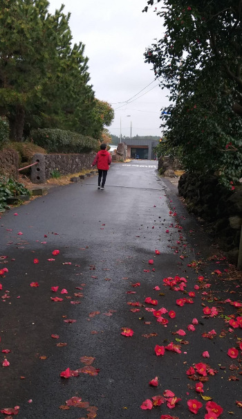 이렇게 호젓한 산간 마을에 3백 년이 넘게 자란 동백나무 군락이 있는 줄 몰랐다. 고목이 된 동백나무에서 어깨와 머리 위로 툭툭 떨어지는 꽃의 듬직한 스침을 느껴보는 것도, 붉게 물든 꽃길을 걸어 보는 것도 딱 이맘때쯤 느끼는 정취일 것이다. 나지막한 돌담장 위에 수북이 떨어진 동백꽃을 바라보며 문득 이런 동네에서 어린 시절을 보낸 사람들은 얼마나 행복할까?라는 생각이 들었다.