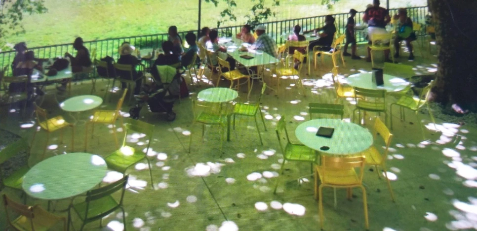 이끼 낀 나뭇가지가 하늘을 가리고 숭숭 뚫린 나뭇잎 사이로 동그란 햇빛이 동그란 탁자 위에 동그란 무늬를 만들어 내고 있다. 미러볼 불빛 같은 햇빛이 호객을 한다.