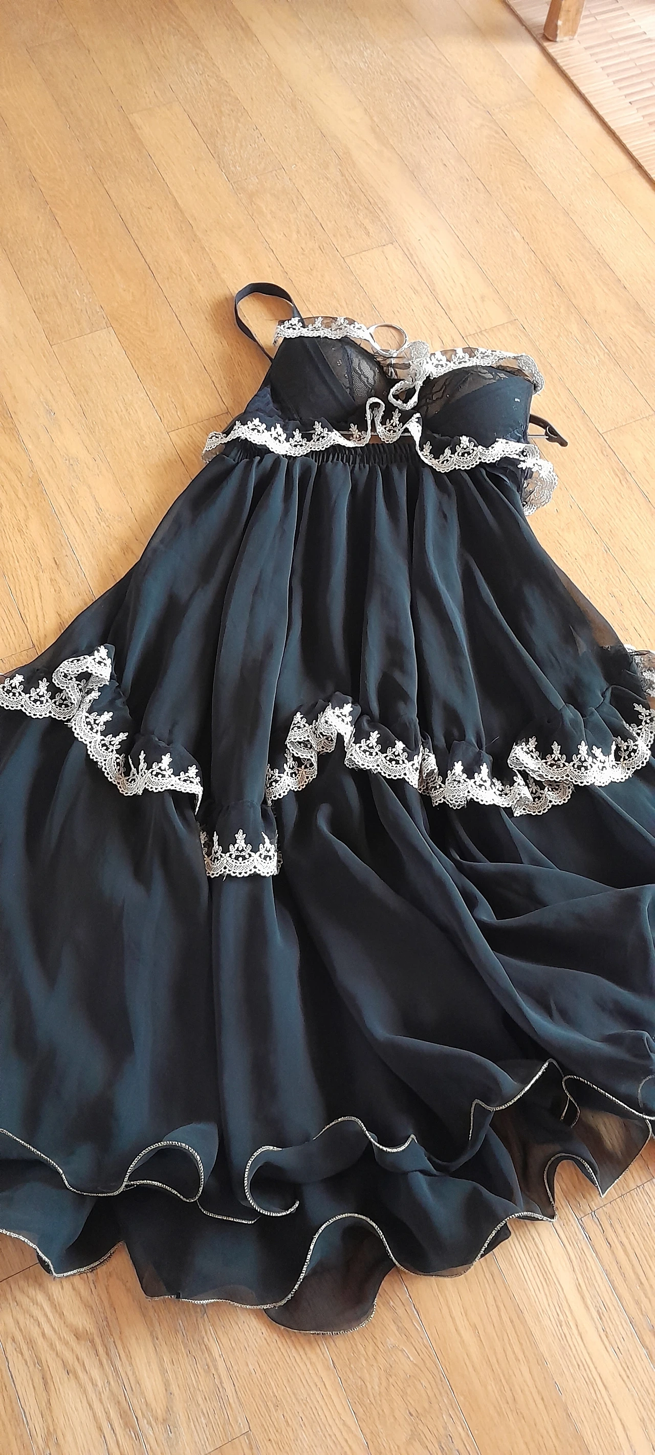 밋밋한 검정 드레스가 레이스 덕분에 화려해졌다. 잔 주름을 잡아 가슴과 치마단에 붙여놓고 나니 누구도 흉내 낼 수 없는 나만의 독창적인 새로운 옷으로 재탄생하였다.