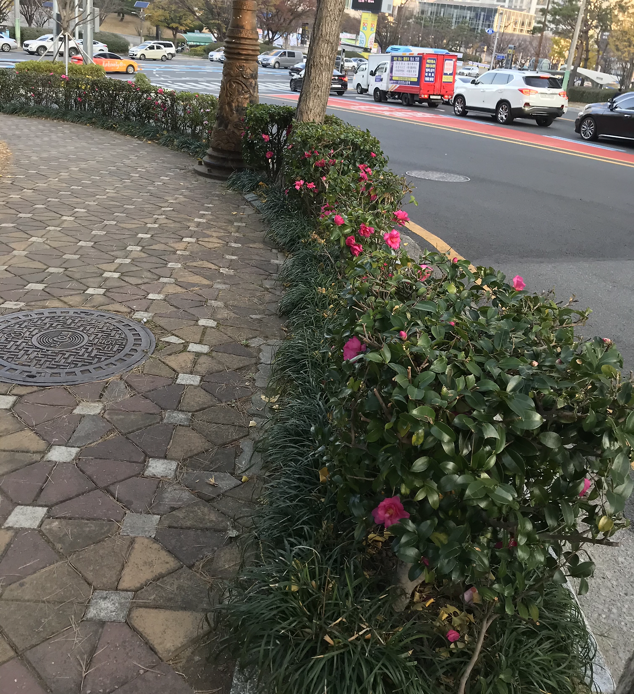 한참을 걸어가면서 이런저런 생각을 해 보았지만 한마디로 세상이 왜 이래다. 길가에 핀 동백꽃이 예쁜 꽃길을 만들어 주건만 그 예쁜 얼굴로 환하게 웃고 있는 꽃들 보기가 민망한 아침이다.