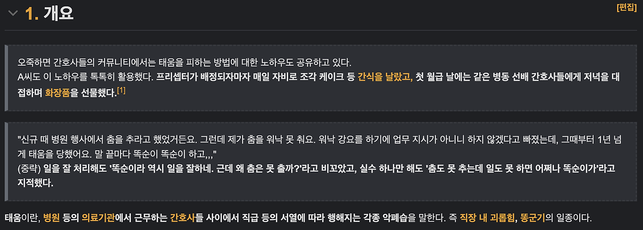 얼마 전 간호법에 대해 검색해 보던 나는 낯익은 단어를 발견했다. 바로 '태움' 이다. 이는 내가 병원에 처음 왔을 때 이해할 수 없던 간호사들 사이의 문화이기도 했다. 이 요상한 단어의 뜻은 포털 사이트나 나무위키의 검색에서도 알 수 있듯이 간호업계에서 아랫직원에게 행해지는 군기를 잡는 문화이다. 그 의미를 풀어보자면, '재가 될 때까지 태운다' 라는 의미에서 '태움' 이라 한다고 한다.