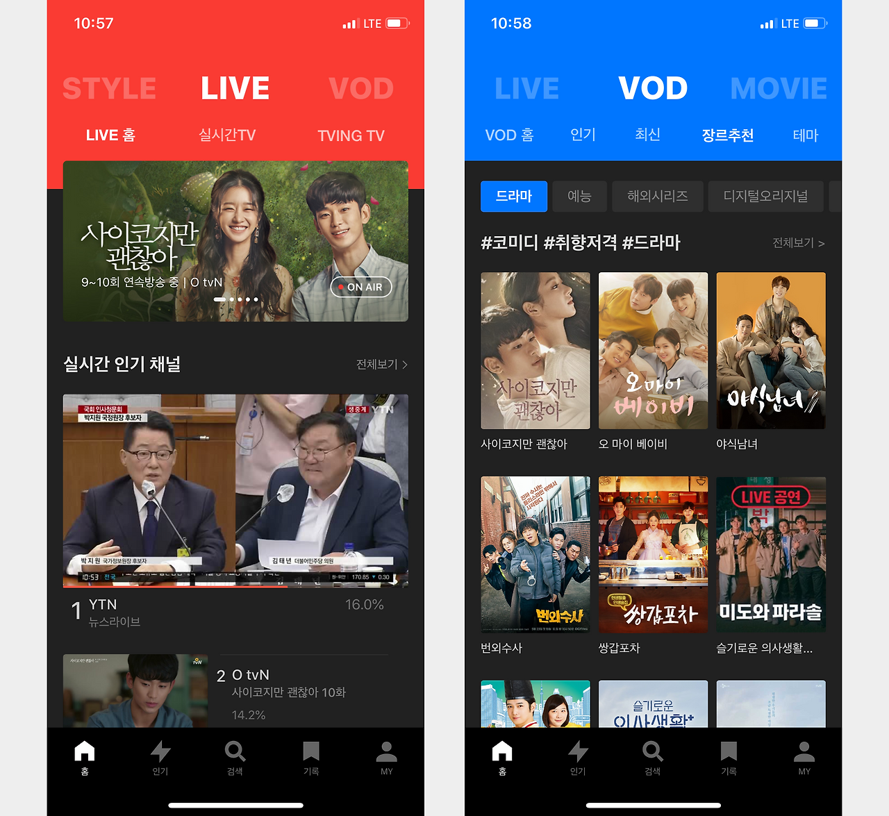 VOD의 도래로 넷플릭스, 왓챠 등 OTT서비스의 사용량이 급증하고있다. 라이브채널 위주였던 '티빙'도 OTT시장에 뛰들게 되는데, 조금 다른 느낌이다. 일단 기본적으로 '티빙'은 tv프로그램 라이브 시청이 가능하다는점과 단순 VOD만 제공하는 넷플릭스나 왓챠와는 다르게 'LIVE / VOD / MOVIE / CLIP / MALL / KIDS / MUSIC / STYLE' 등의 메뉴를 제공하고있다. 이에 따라 화면 구성이 다소 조잡해보였던 점 외의 아쉬웠던 부분에 대해 말하고자한다.