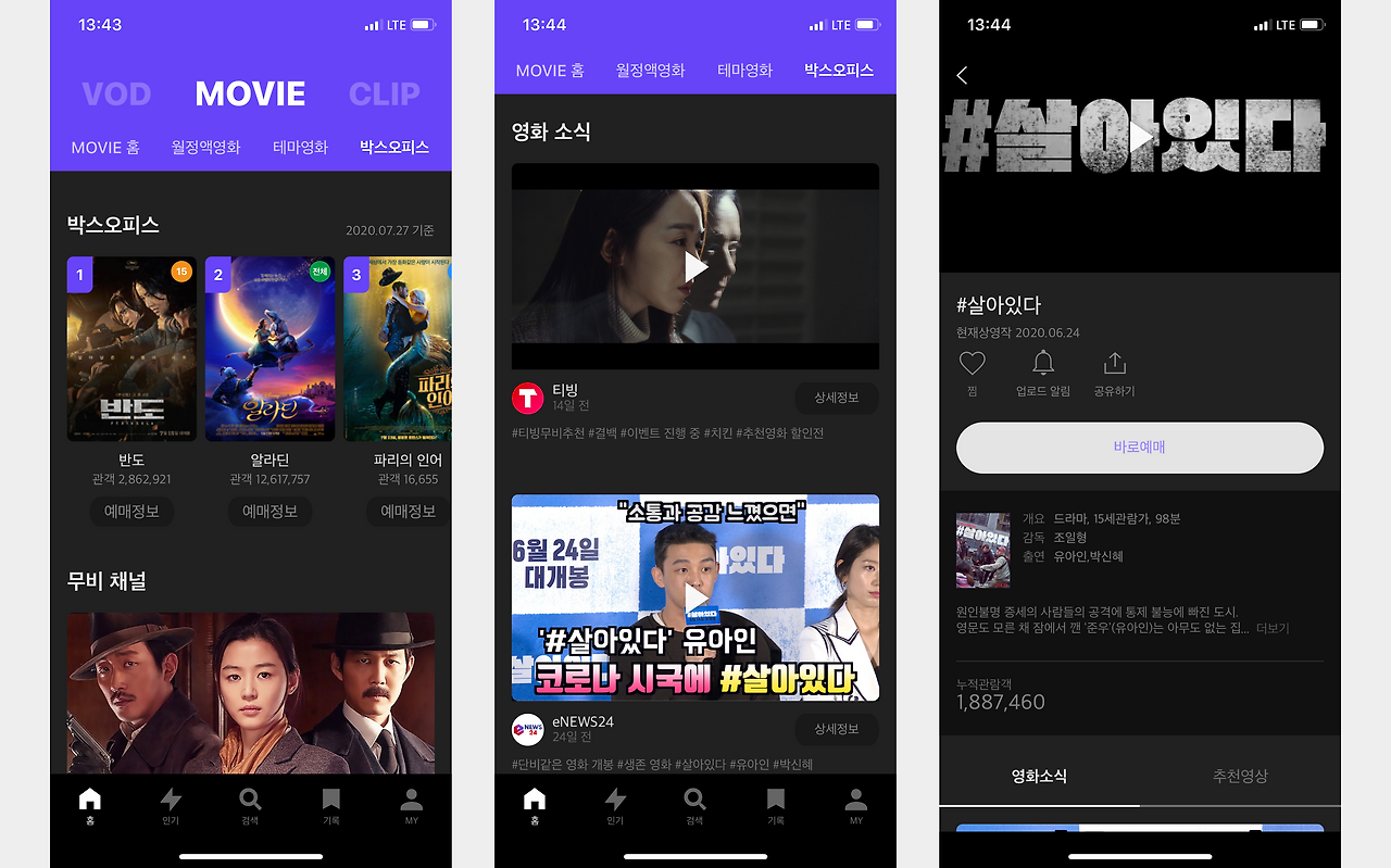 혼란스러움은 이제 시작이다. 'MOVIE' 메뉴 안에 있는 박스오피스 탭에 들어가면 '영화소식'이라는 구성이 있는데 정체를 알 수 없다. 영화와 관련된 소식을 알려주는 구성같은데 막상 '상세정보'를 눌러보면 그냥 해당 영화의 예고편과 예매하기로 넘어갈 수 있는 화면이 나온다. 해당 콘텐츠를 작성한 것과 같은 'eNEWS24'의 우측에 붙어있는 버튼이라 상단에 있는 인터뷰 영상이나 작성자의 상세정보를 볼 수 있을 것 같은 ui로 디자인해놓았지만 정작 내용은 생뚱맞은 영화의 예고편이었다. 차라리 '상세정보'의 버튼을 작성자의 우측에 놓는 것이 아니라 동영상의 바로 하단에 '예고편 보러가기'등의 버튼을 넣는것이 훨씬 좋을 것 같다고 생각했다.