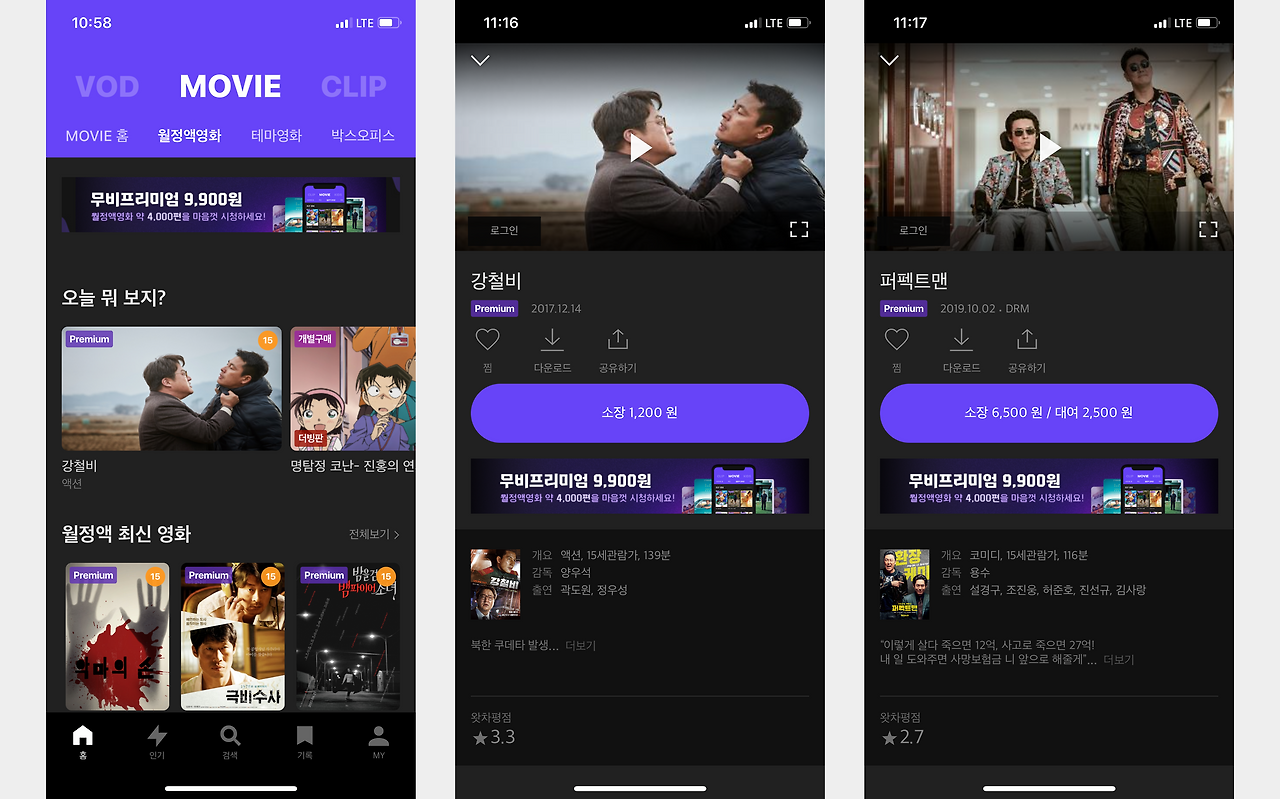 아쉬운 부분은 여기서 멈추지 않는다. '오늘 뭐 보지'라는 구성과 '월정액 최신 영화'의 카드 디자인이 다르게 되어있으므로 다른 내용을 보여줄 것 같은 느낌을 주는데 사실상 상세영역으로 눌러보면 같은 디자인이 나온다. 바로 VOD를 시청할 수 있는 플로우임에도 불구하고 다르게 디자인이 되어진 이유가 있을까? 워딩만으로도 구분이 가능하다고 생각한다.