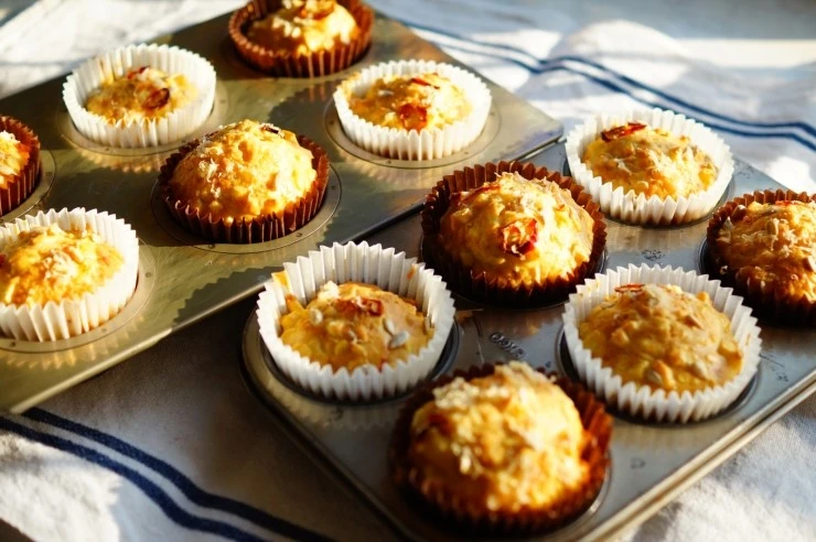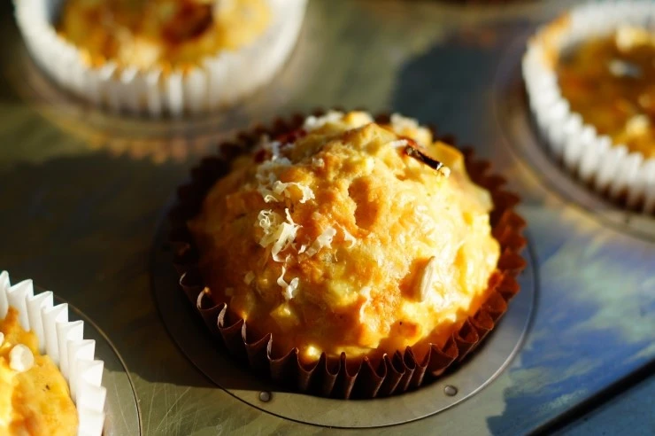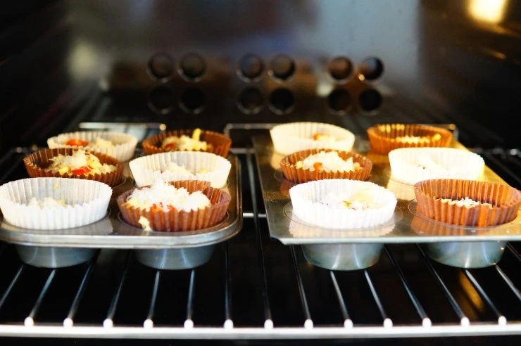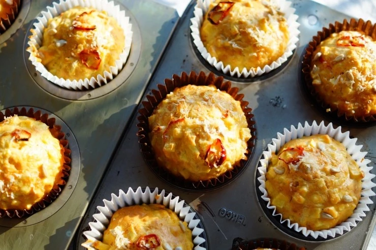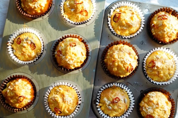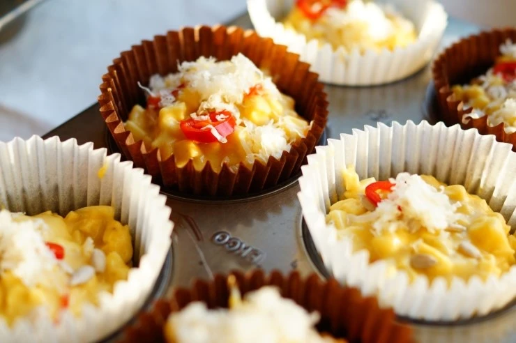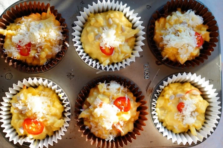 완성된 반죽을 머핀 컵에 적당량 채운 뒤에 반죽 위에 슬라이스 한 붉은 고추, 해바라기씨, 파마산 치즈를 올려 장식하고 화씨 350도(180도에 맞춤)로 예열한 오븐에서 45분 구워내면 완성이에요.