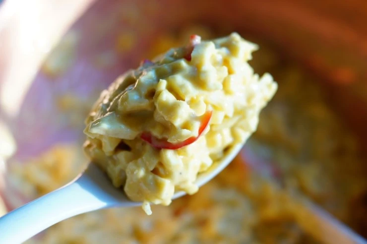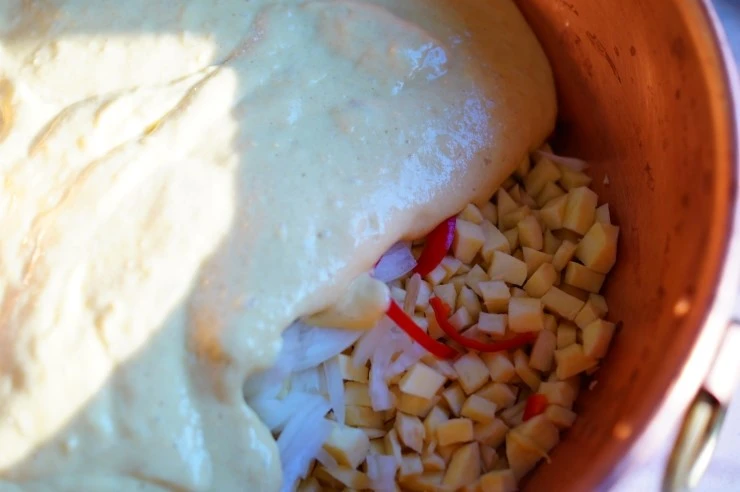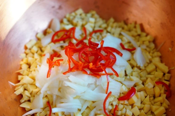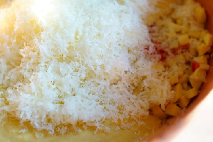 고구마를 잘게 썰어서 큼지막한 볼에 담고 샬롯(없으면 양파로 대체)과 붉은 고추를 얇게 채 썰어 더합니다. 계란을 풀어 코티지치즈와 통밀가루, 파마산 치즈를 넣고 저은 반죽을 고구마에 부어 잘 섞어줍니다.