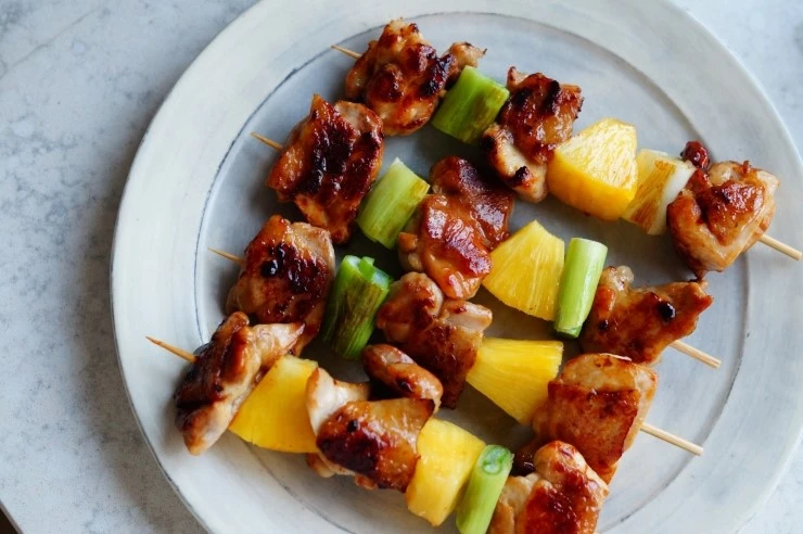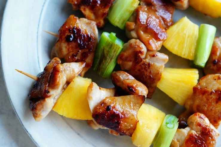 파와 파인애플, 닭살을 한 입 크기로 썰고 간장 1/4컵, 설탕 1 큰 술, 미림 1/4컵을 섞어 끓어오르면 불을 줄여 약간의 점도를 가진 소스를 만든다.팬에 파와 파인애플을 구워내고 닭살도 굽는다. 넓적다리 살을 구 울 때는 껍질 있는 쪽을 먼저 굽고 소스를 발라가며 구워 놓은 후에 꼬치에 끼워서 상에 올리기 전에 오븐의 그릴에 한 번 더 구워서 낸다.