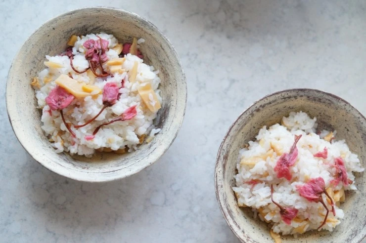 초절임을 한 죽순을 섞고 벚꽃 절임을 얹어냈다.