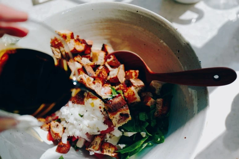 올리브오일 2 큰 술에 발사믹 식초 1 큰 술, 메이플 시럽 1 큰 술을 섞어서 드레싱을 만든다.