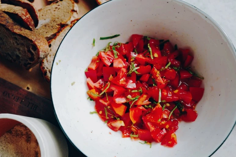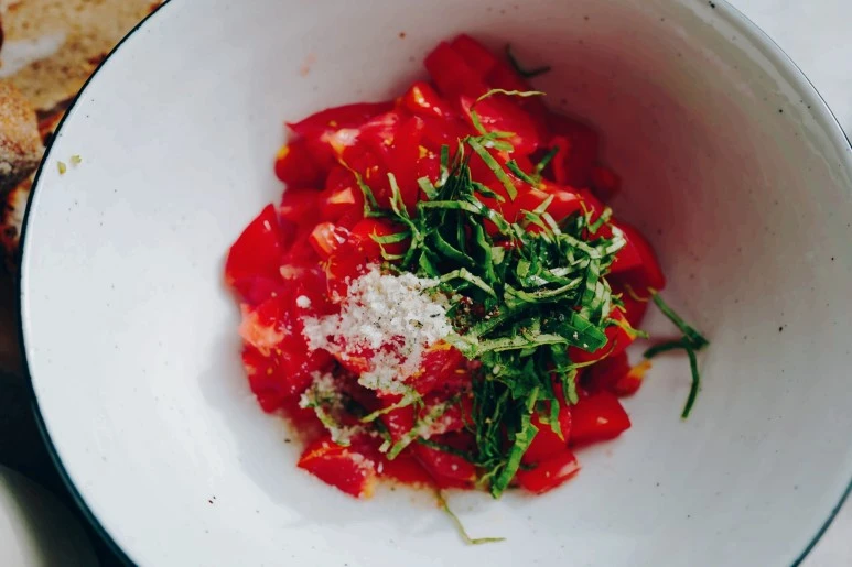 토마토는 먹기 좋은 크기로 썰고 바질 잎은 가늘게 채를 치거나 손으로 뜯어서 넣고 소금, 후추, 올리브오일에 섞어 이십 분 정도 재운다.