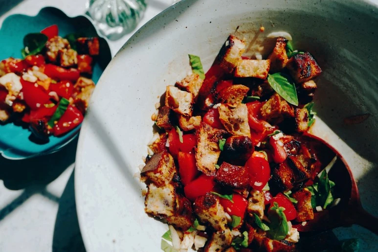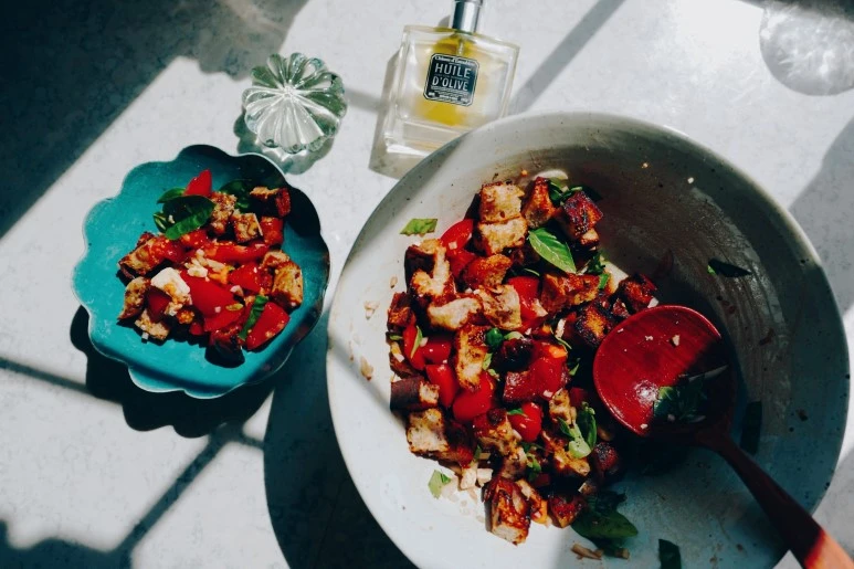 기본은 샐러드다. 보통은 푸른 잎채소와 함께 올리지만 마땅한 샐러드감이 없을 때는 마당에서 뜯어온 바질과 토마토만으로도 충분하다. 올리브 몇 알을 더하면 화장한 것처럼 맛도 모양도 예뻐진다. 올리브오일에 소금, 후추면 끝인데 간혹 화이트 와인 식초를 살짝 더할 때도 있다. 감칠맛이 더해진 토마토 샐러드가 담긴 볼은 언제나 싹싹 비워진다.
