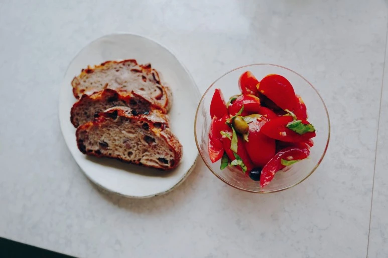 역시 토마토를 한 입 크기로 썰고 바질 잎을 뜯어 넣는다. 발효빵이 200그램 정도면 토마토 2개에 바질 잎은 취향껏 넣는다, 마침 페타 치즈가 있어서 비슷한 크기로 조금 썰어서 더했다.