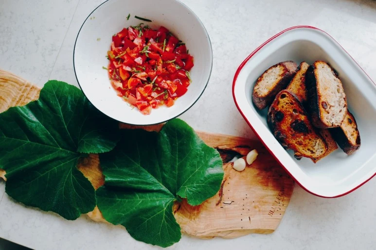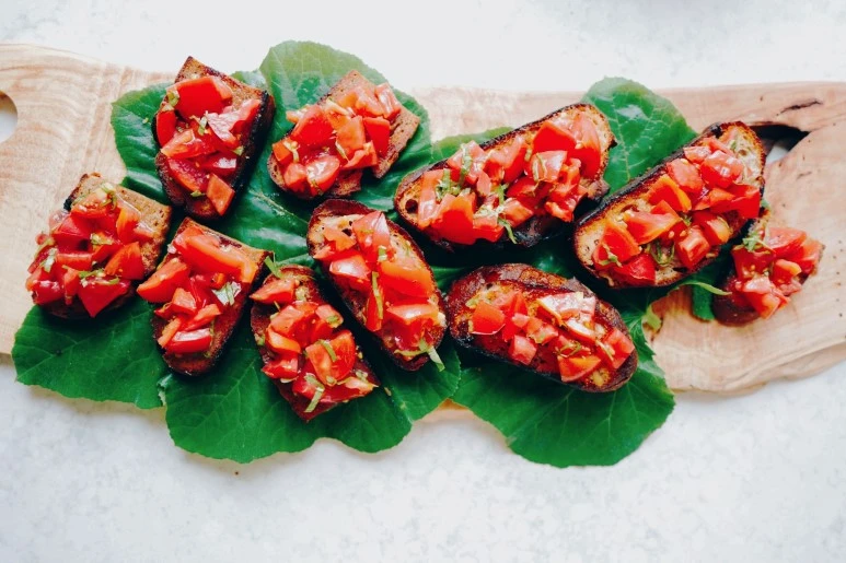 주말 아침, 마땅히 올릴 게 없을 때 쓱싹 만들어서 도마 위에 푸른 잎을 깔고 식탁 가운데에 두면 눈 만큼 입도 즐겁고 손도 바쁘다. 토마토 브루스게타다.