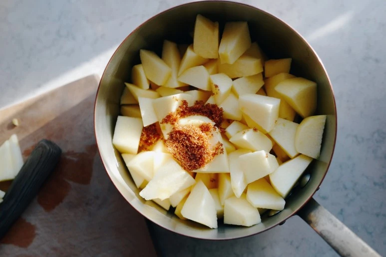 사과 껍질을 벗겨내고 한 입 크기로 썬 사과를 냄비에 넣고 황설탕 반 큰 술에 물 1/4컵을 넣고 중간 불에서 10분간 조려 사과가 부드러워지면 건져서 식혀두기. 이건 뭐 어려울 게 없다!