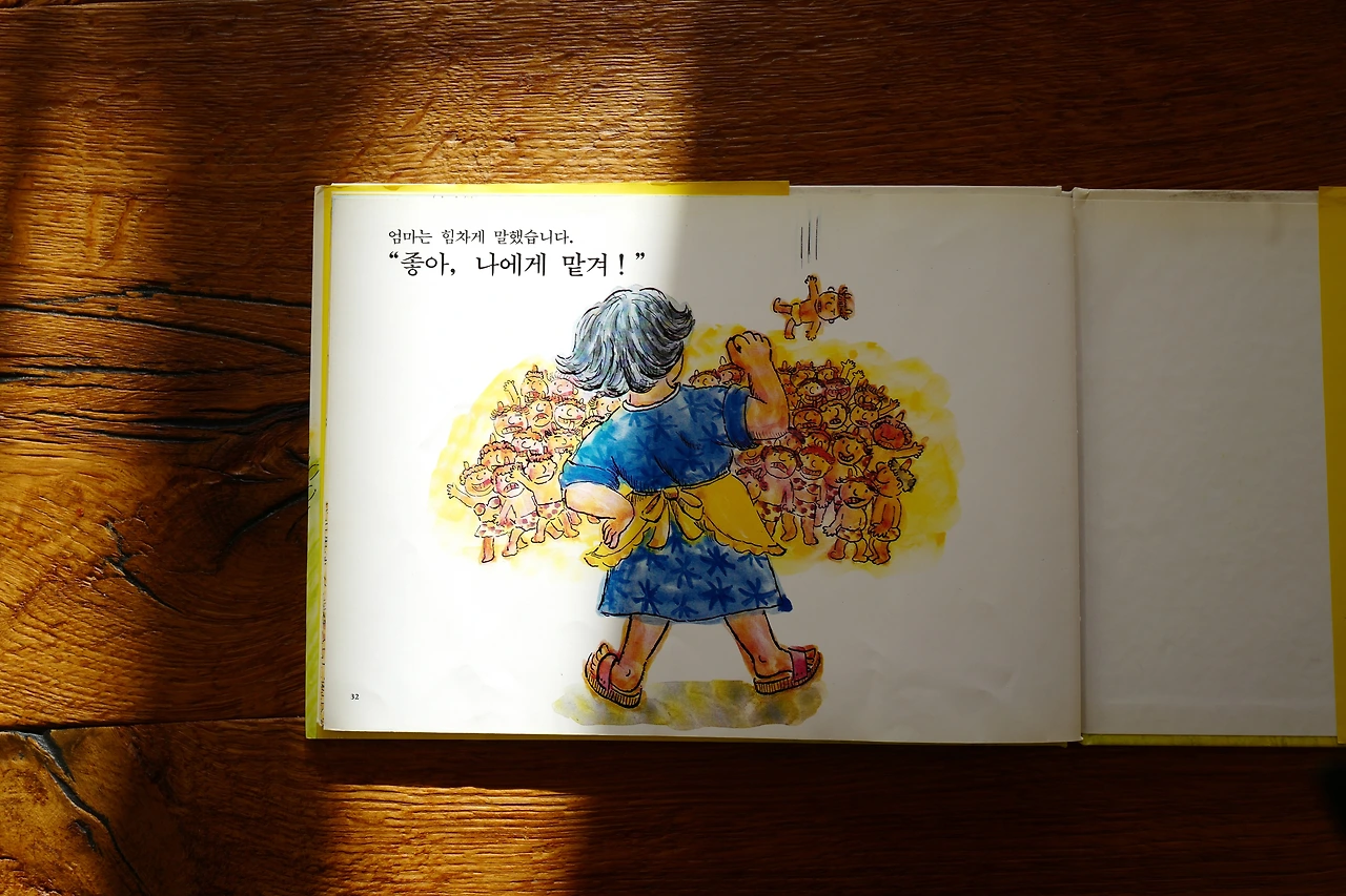 그림책 속의 그녀는 뒷모습까지도 당당하다. 나는 많지도 않은 식구들의 식사를 준비하는 일만으로도 힘에 부칠 때가 있다. 끼니때마다 거를 수 없는 설거지와 매일 쌓이는 빨랫감, 어느 곳이든 가리지 않고 내려앉는 먼지 앞에서 주눅 드는 사람이다. 어제 완벽하게 끝냈다고 생각했던 일이 오늘 아침 더 많아진 설거짓감, 한결 커진 빨래 더미가 되어 내 앞에 놓여도 한숨 대신 “좋아. 나에게 맡겨!”라고 외칠 수 있다면 얼마나 좋을까?