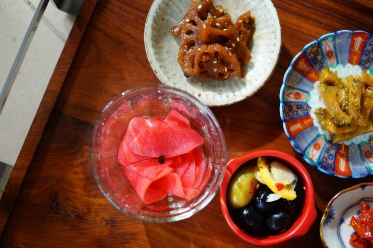 곰취 장아찌, 매실장아찌, 깻잎장아찌, 양파김치, 여주 장아찌, 더덕장아찌, 연근조림, 고추부각, 구이김, 올리브 절임, 과일무피클, 양파 초절임 ~~~~