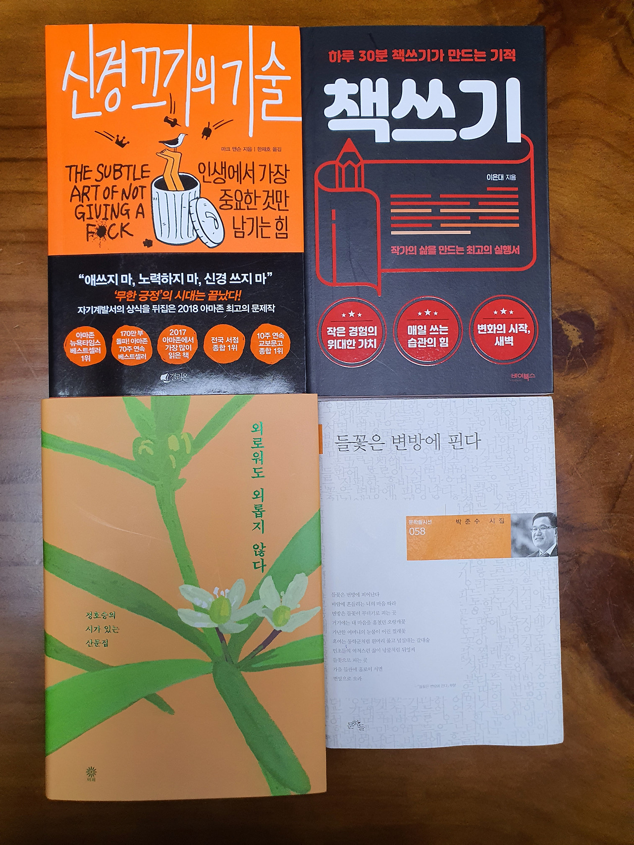 카톡 독서모임 책공미 2기를 운영 중이다. 평소는 20명의 멤버들이 하루 2쪽 읽은 책을 제목과 함께 번호순으로 인증하며 독서습관을 응원한다. 작은 몸짓이지만 효과는 제법 크다. 회원들이 올린 완독 인증에 서로 축하도 하며 이야기를 나눈다. 읽고 싶은 책도 소개하고, 좋은 문장 선물하는 재미도 솔솔 하다. 취향이 다르기에 다양한 책을 접하게 된다. 혼자 하는 다짐으로는 목표 달성이 쉽지 않다. 회원들과 함께라 마음 다잡기도 한결 쉬어 목표 달성가능성이 높아진다. 독서습관을 위한 최소한의 노력인 셈이다.