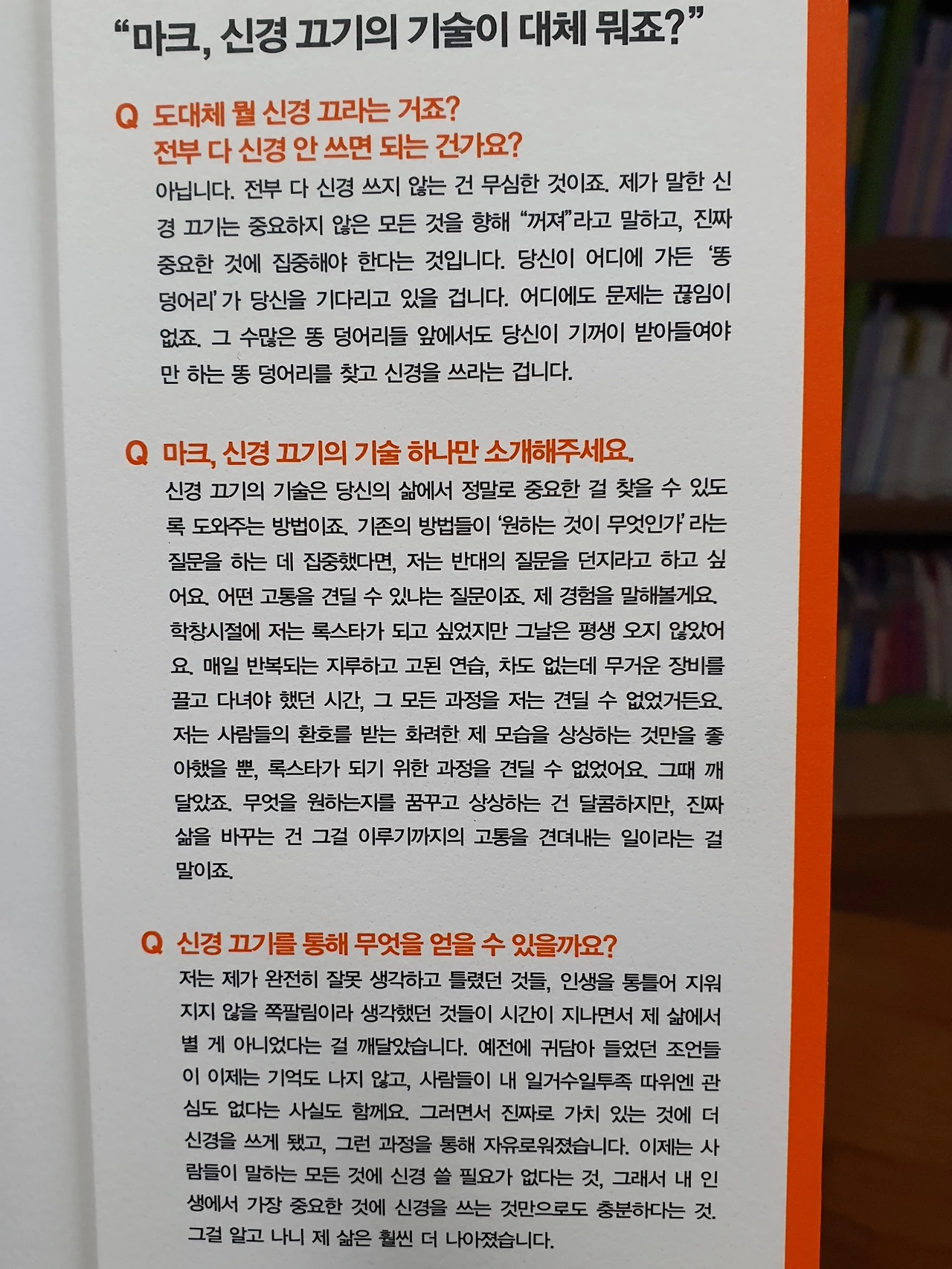 “필요한 것은 '신경 끄기의 기술' 이다. 이 기술은 삶의 방향을 재조정하고 중요한 것과 그렇지 않은 것을 구분하게 해주는 단순한 방법이다. 이 능력을 발달시키면, 삶이 어느 정도 고통스럽다는 사실을 순순히 인정하게 된다. 우리가 무슨 일을 하며 어떻게 살아가든 인생은 실패, 상실, 후회를 수반하고 마지막엔 죽음이 찾아온다는 것을 받아들이는 것이다. 좋은 삶을 살려면, 더 많이 신경 쓸게 아니라, 더 적게 신경 써야 한다.”