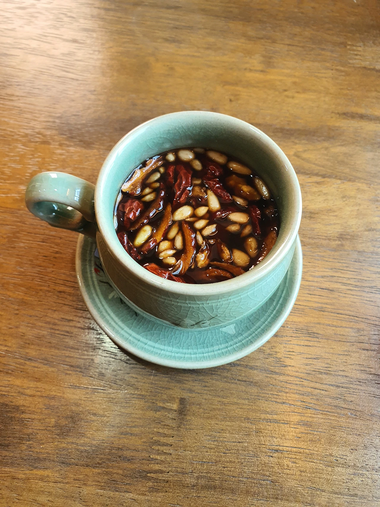 한잔에 9천 원 하는 경옥고 차다. 생지 황취즙, 인삼가루, 백밀련을 고루 섞어서 사기 항아리에 넣고 유지 5겹과 두꺼운 천 1겹으로 항아리의 아가리를 꼭 봉한 다음, 구리 냄비 속에 넣어 수중(水中)에 매달아 놓고 항아리의 아가리는 물 위로 나오게 하고 뽕 나물 불로 3일 동안 끓여서 만든다고 한다. 대추, 잣, 계피, 밤 등 고명을 넣었다. 보약 한재를 먹은 기분이었다. 문득 떠오른 생각 "과연 그러할까?"정성으로 만들었다면 9천 원은 결코 아깝지 않을 것이다. 똑똑한 소비가 필요한 시대다.