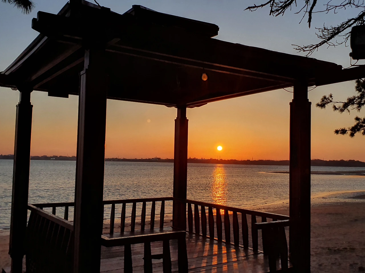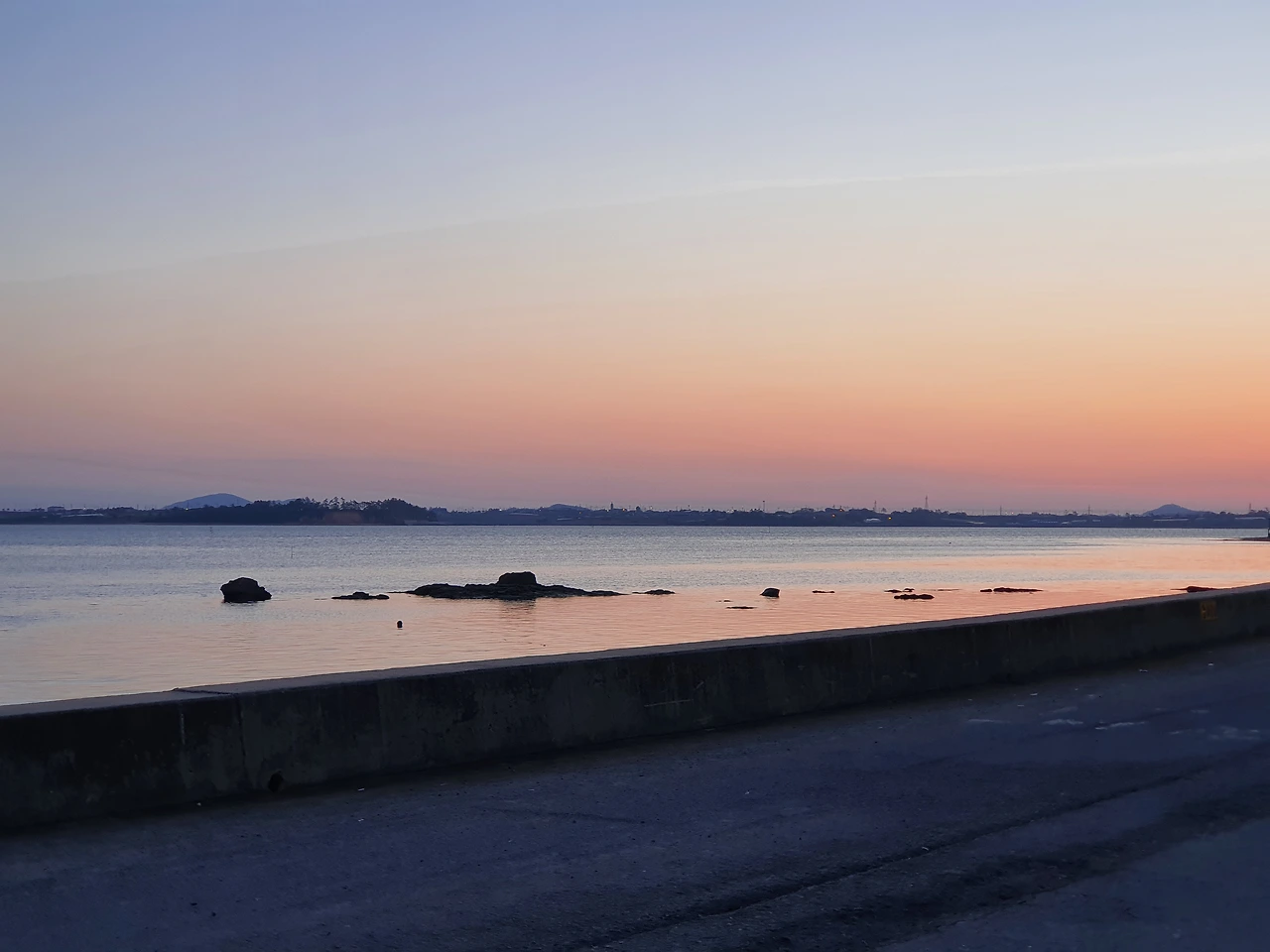 바닷가 일몰시간은 장면마다 놀랍습니다. 매직 아워라 불리는 시간은 누구나 아마추어사진작가가 됩니다.석양은 사라졌지만 옅은 붉은빛, 연한 푸른빛 데코레이션은아름답다고 표현하기에는 부족합니다.