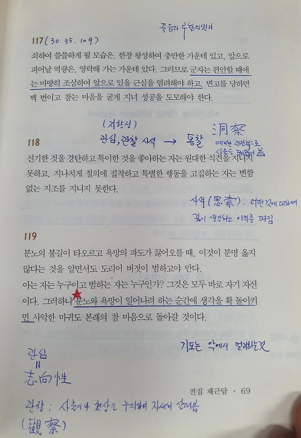 바쁜 와중에도 여유를 가지려면 모름지기 먼저 여유 있을 때 의지할 근거를 찾아 두어야 하고, 소란스러운 와중에도 고요함을 유지하려면 모름지기 먼저 고요할 때 중심을 세우고 있어야 한다.(전집 182)