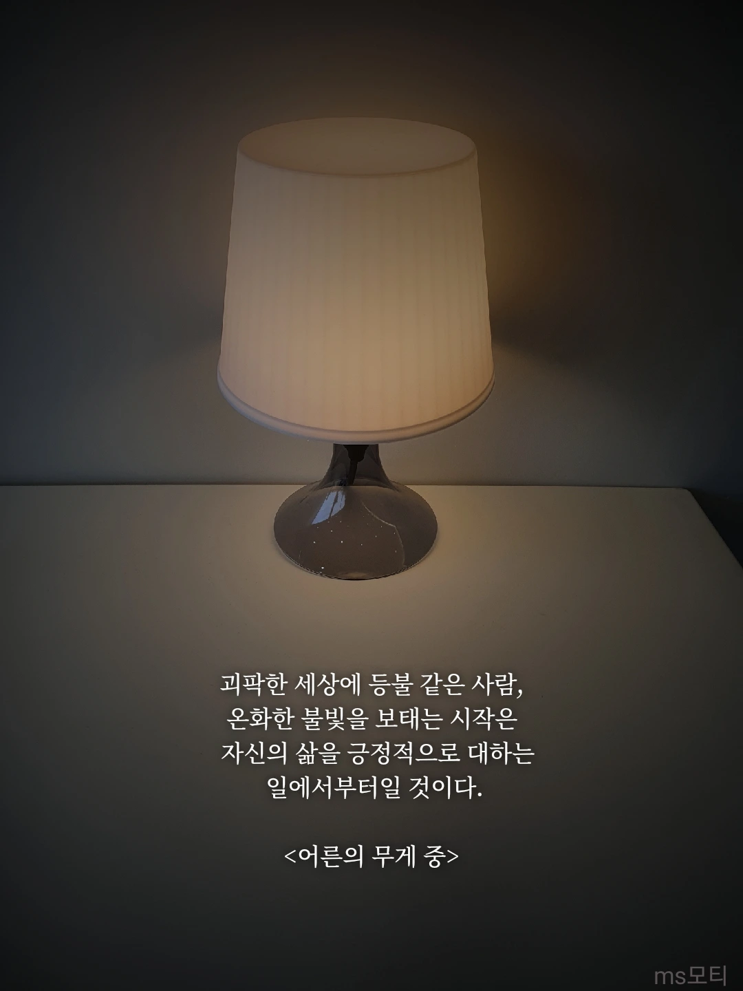 내 마음을 읽는 듯 공감되는 문장을 만나면 멈추게 된다. 장한이 작가님의 <어른의 무게>를 읽으면서 직장인의 비애가 이입되어 씁쓸했다. 직장생활을 즐기면서 하는 사람이 얼마나 있겠는가? 견디고 버틴다는 표현이 어울릴지 모른다. 그러나 일에만 함몰되어 있으면 마음이 황폐해지기 쉽다. 마른땅에 생명이 나기 어렵듯, 메마른 감정에선 관계라는 싹은 잘 자라지 않는다. 그러다 있어야 할 곳, 나누어야 할 시간은 훅 지나간다. 어느 순간 후회의 쓰나미가 밀려와 존재를 흔들기도 한다. 덜 후회하는 삶을 살자고 다짐해본다. 몇 년마다 돌아오는 승진시기 전에는 성과(근무평정)에 포로가 된다. 나는 작아지고 책임의 무게를 온몸으로 져야만 한다. 주변을 보면 편하게 가는 사람도 있는데 나만 힘든 것 같다.