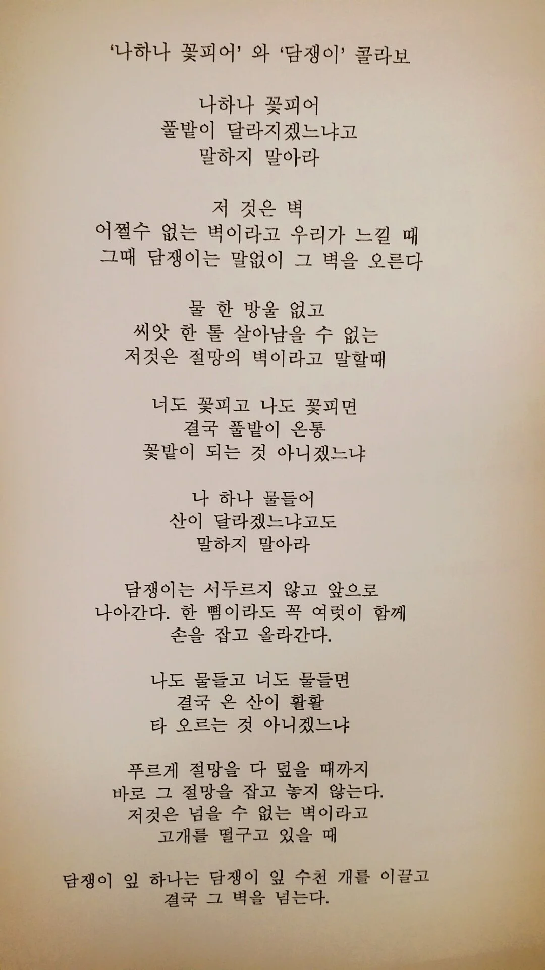 몇 년 전에 좋아하는 시 두 편을 연결해 보았습니다. 나부터 먼저 변하고 주변을 점차 바꾸는 의미라 좋습니다. 담쟁이는 생명력이 강합니다. 물이 없고 생명이 없는 절망의 벽을 연대하여 함께 넘습니다.