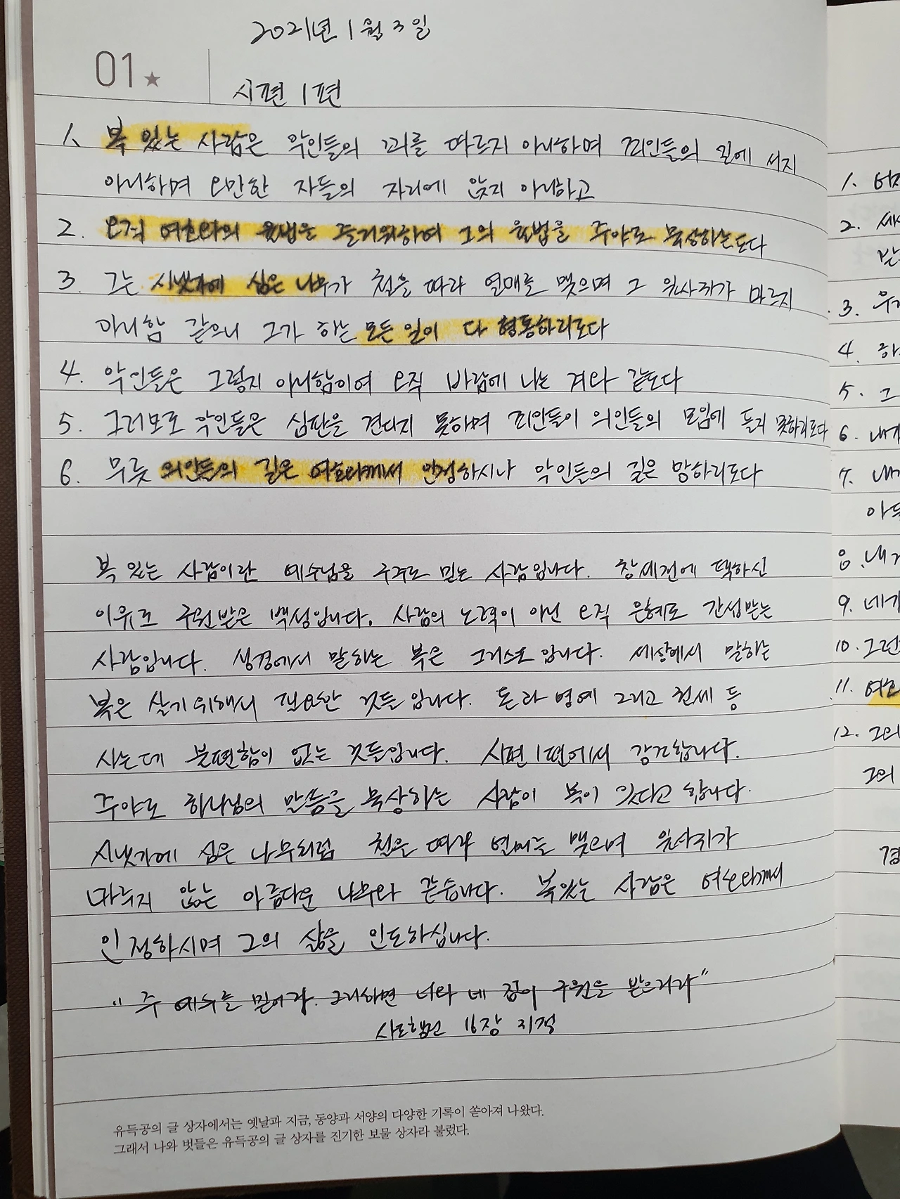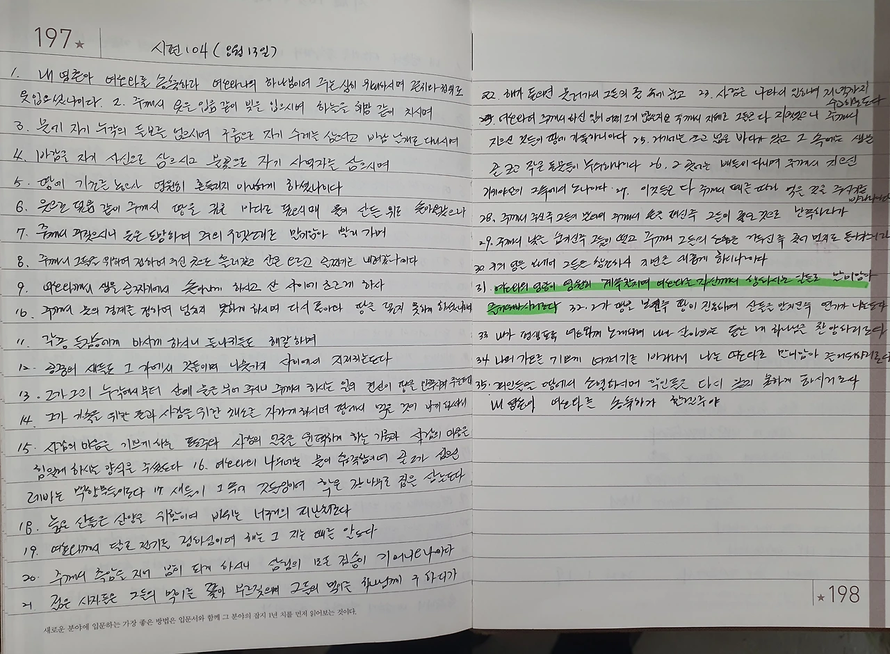 힘들어하는 지인들에게 필사 효과를 전하기도 합니다. 방황하는 크리스천에게는 성경 필사를 권하는 편입니다. 몇 달 후에 큰 도움이 되었다는 분들도 계셨습니다. 아는 것과 해본 것은 큰 차이가 있습니다. 꾸준히 해보면 비로소 알게 됩니다. 평소 자주 불안하거나 들뜬다는 분들에게 필사는 도움이 될 것입니다.