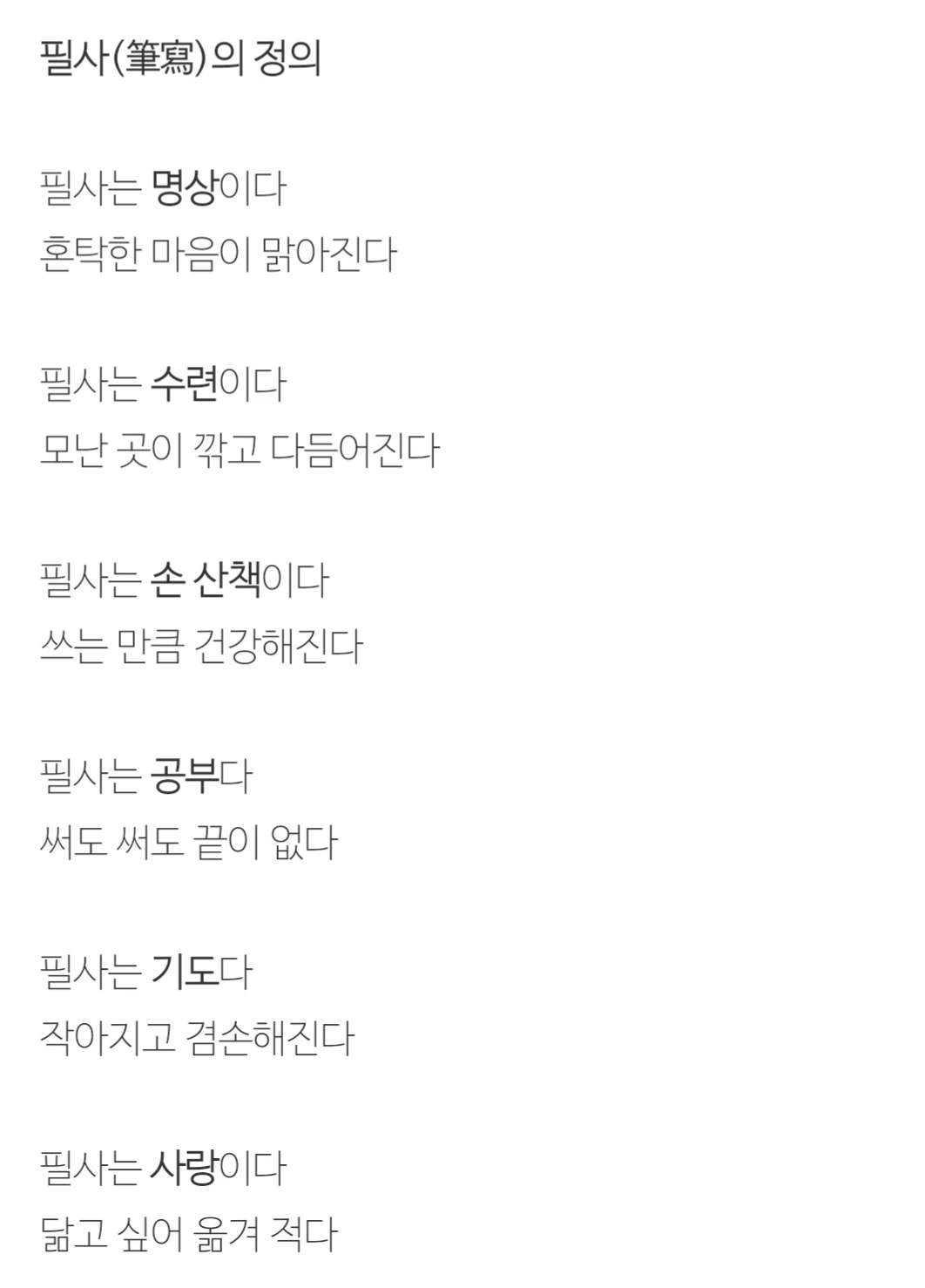 짜증을 자주 냈던 때, 즉흥적으로 했던 행동들, 해야 하는 일보다 하고 싶은 일을 했던 기억들이 떠오릅니다. 필사 후에 아내와 다툼도 줄어들었습니다. 필사는 손으로 하는 자기 수양입니다. 쓰는 동안 쓰는 행위에 집중하게 됩니다. 분량에 따라 3분, 어떤 날은 30분 이상을 쓰기도 합니다. 짧은 날에는 여백을 기도하며 채웁니다.