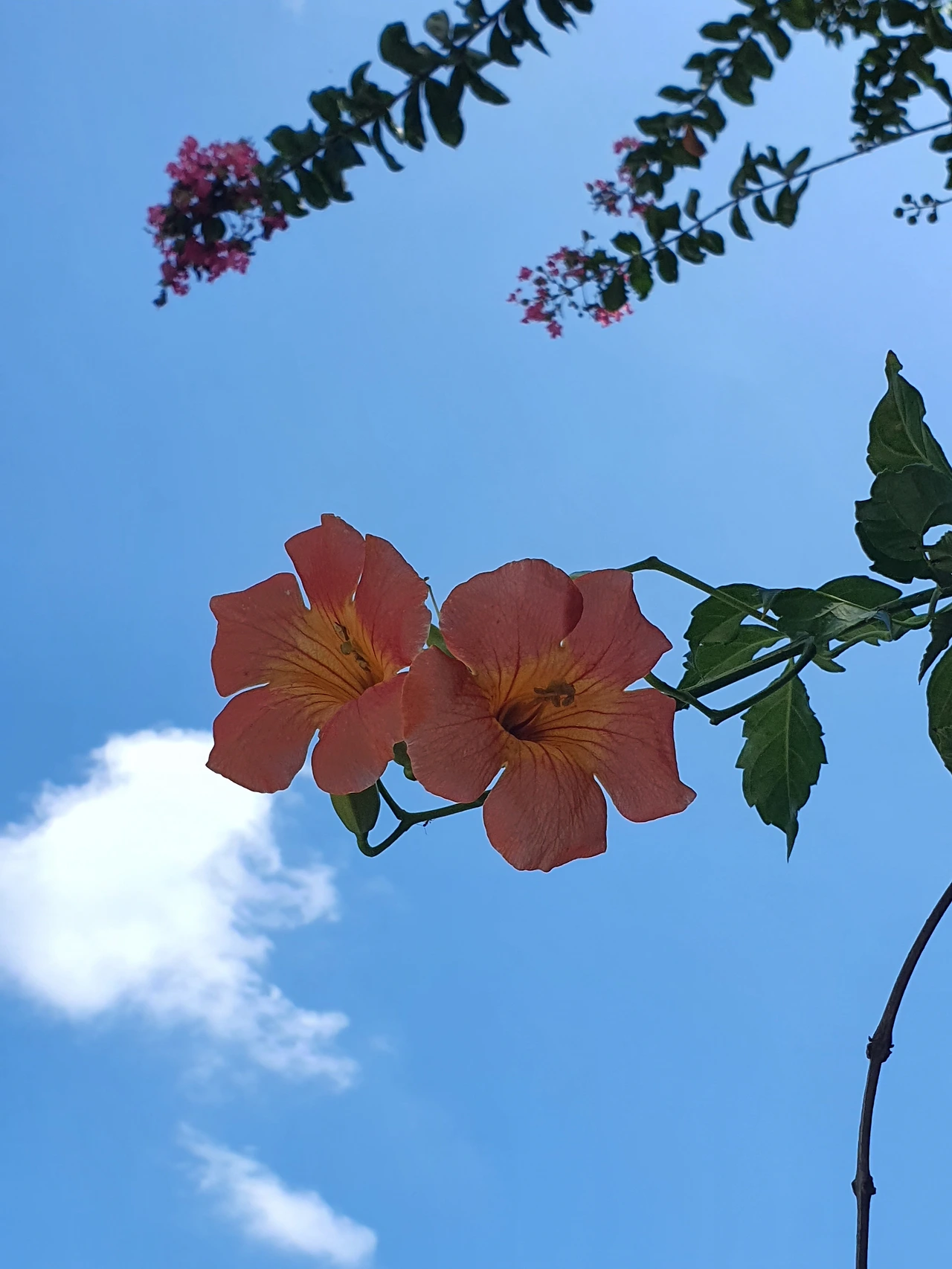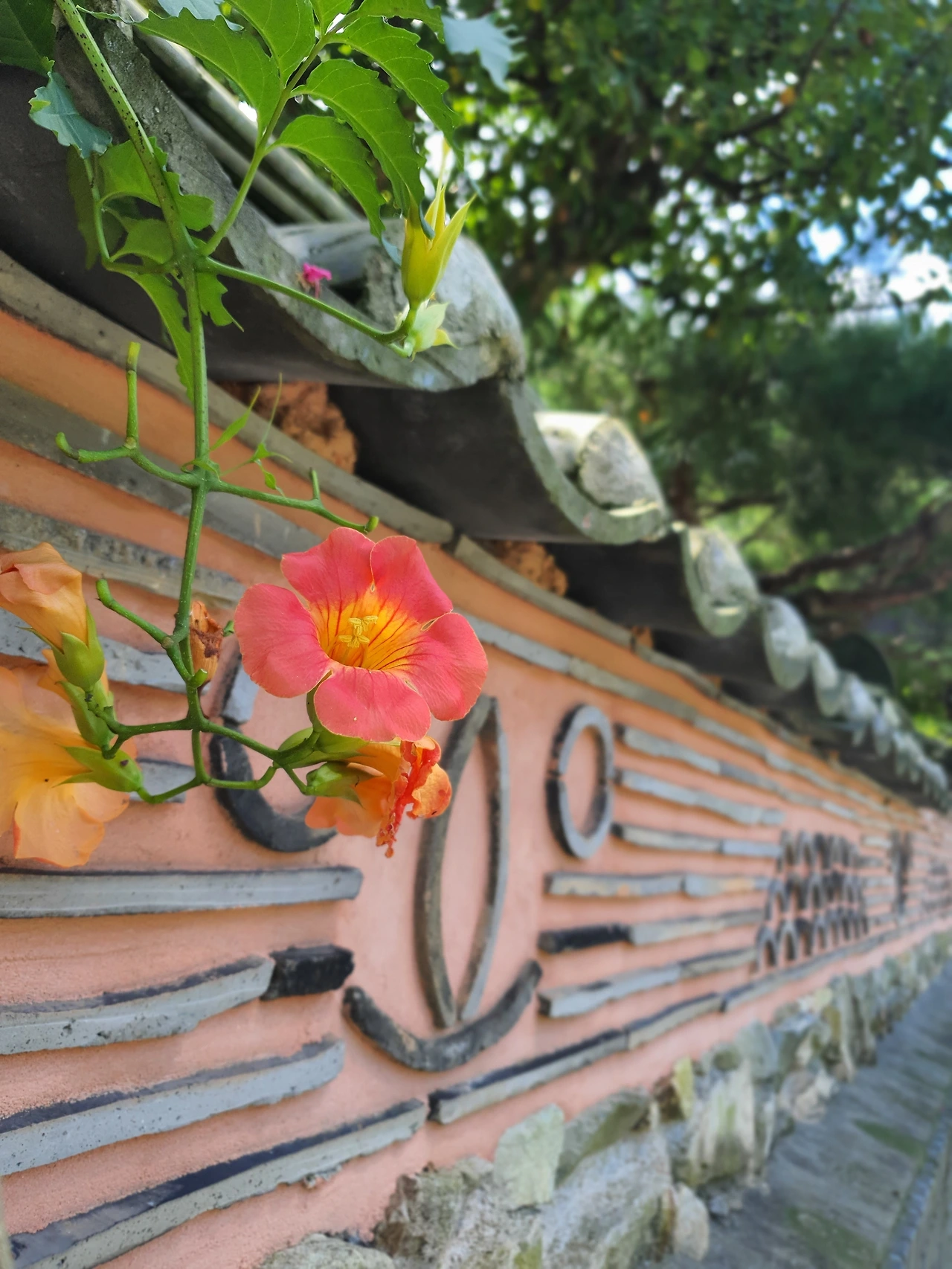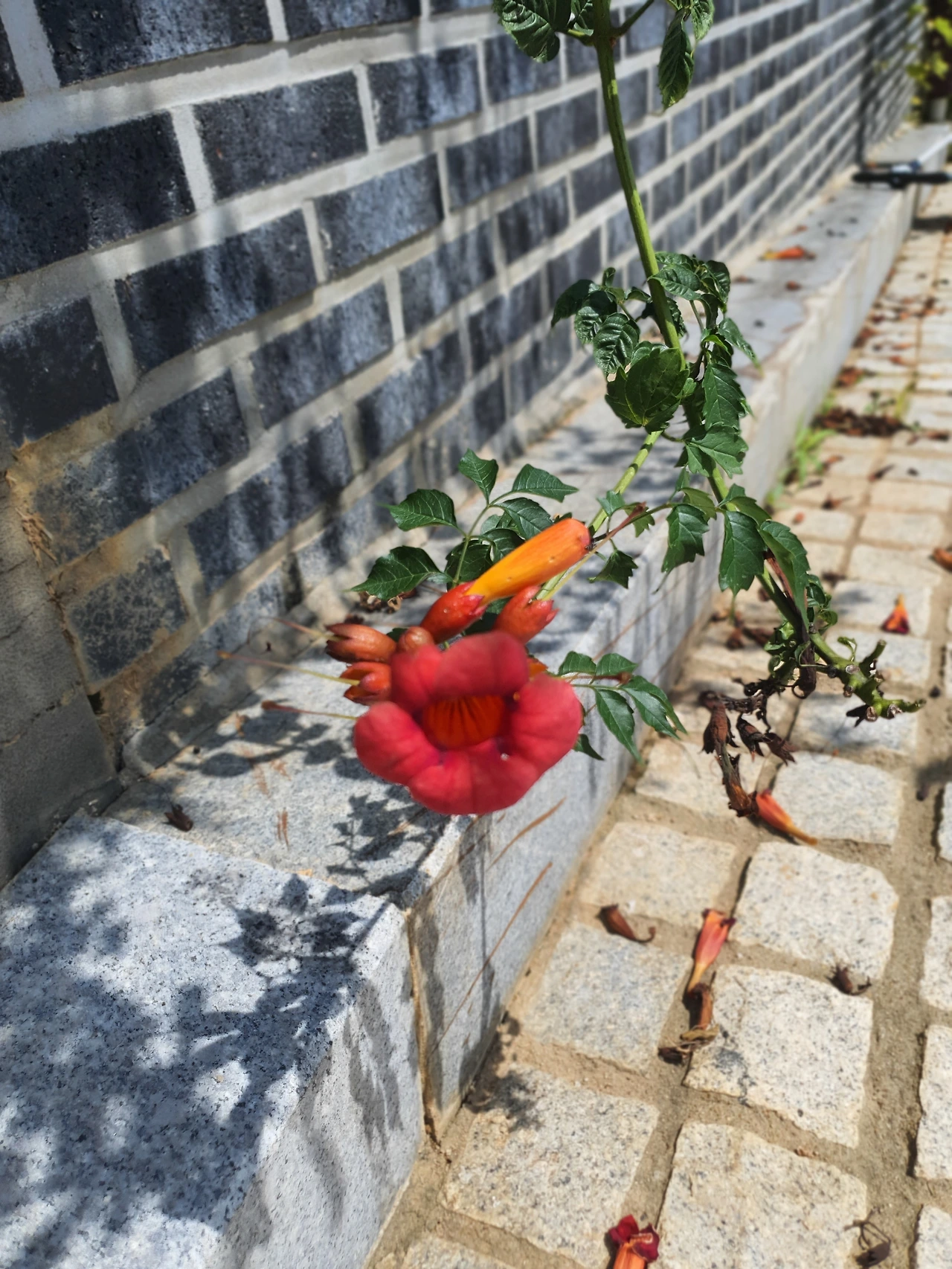 아내는 능소화를 좋아합니다. 능소화를 발견하면 그때라도 잠시 쉬었으면 하는 바람을 담아 사진을 보냅니다. 아내는 "와. 예쁘다" 라며 고마움을 표합니다. 능소화를 양반집 마당에만 심을 수 있었다는 이야기가 있어, 양반꽃이라고 부르기도 합니다. 가지는 벽에 붙어서 올라가며 꽃은 8~9월경에 피고 색은 귤색인데, 안쪽은 주황색입니다. 화관은 깔때기와 비슷한 종 모양입니다. 능소화는 피어있을 때는 아름답지만 떨어질 때는 툭하고 처량하게 떨어지는 특징이 있습니다. 꽃은 피고 지면서 삶과 죽음을 말해줍니다. 떨어진 능소화는 덧없음을 말하는지도 모릅니다.