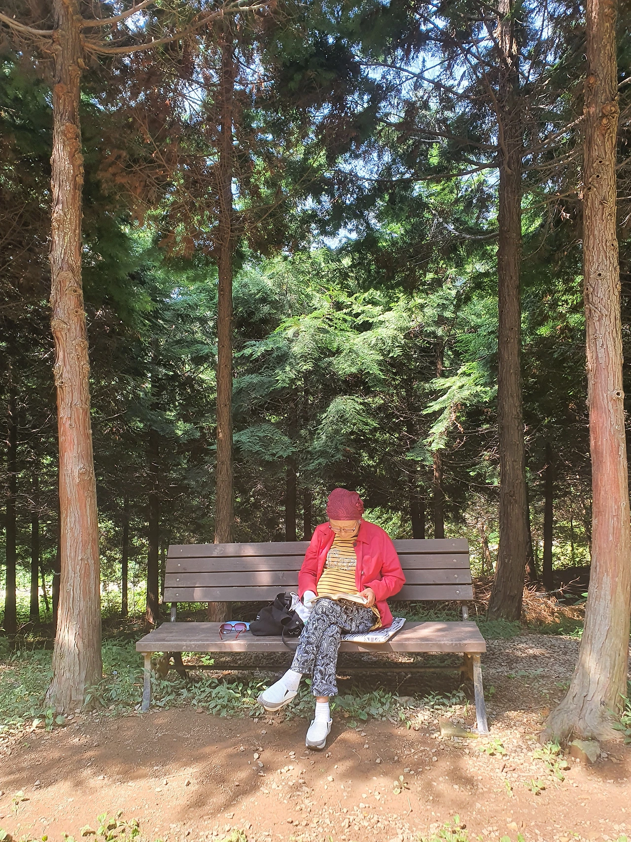 숲 속 벤치에서 책을 읽는 모습이 좋아 보여 말을 건넵니다.