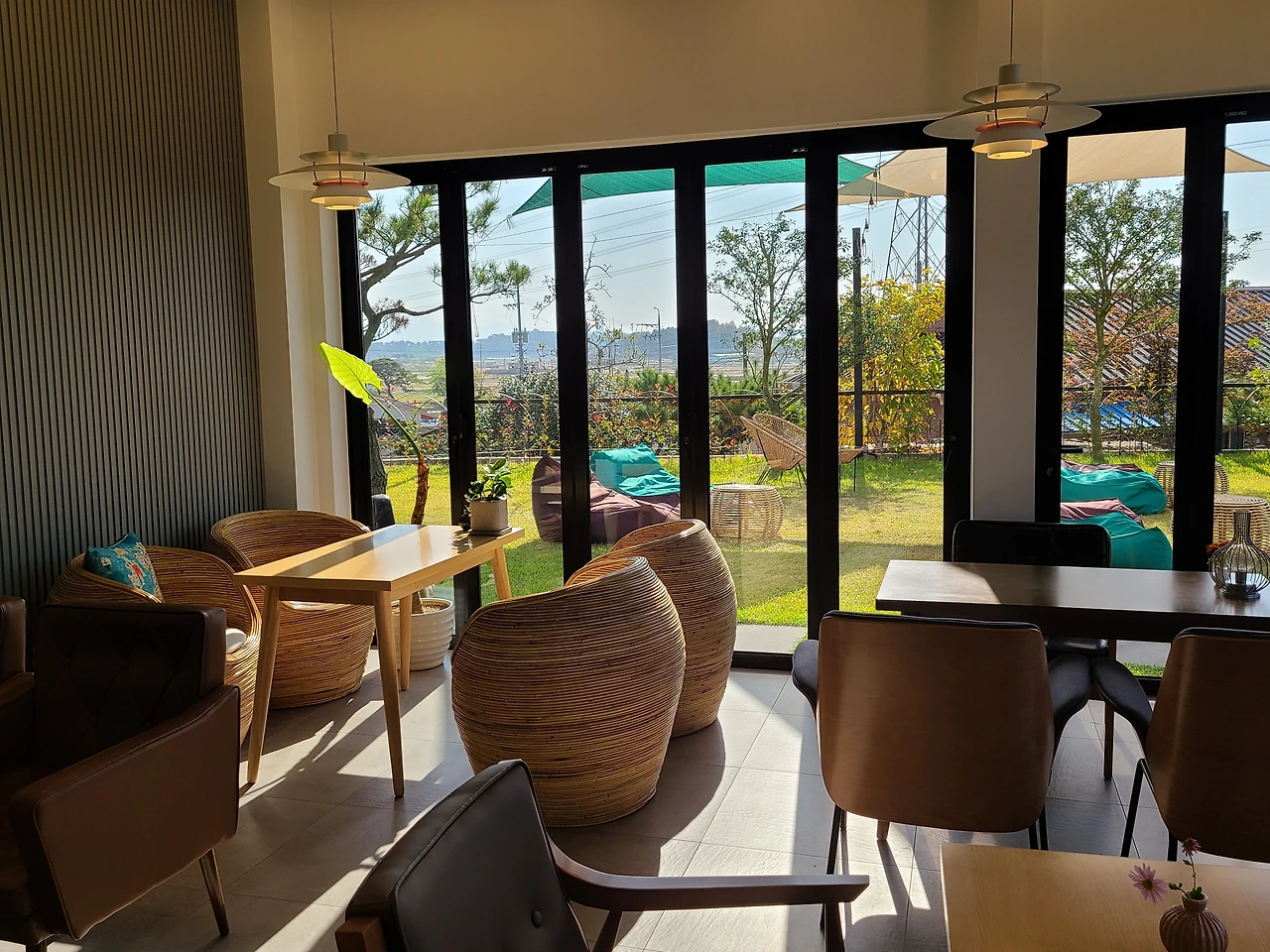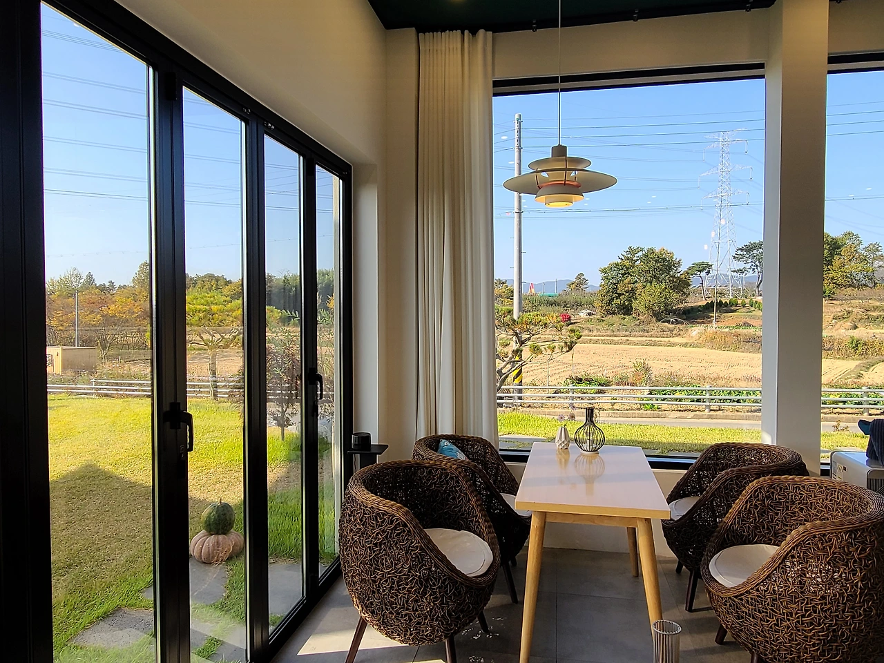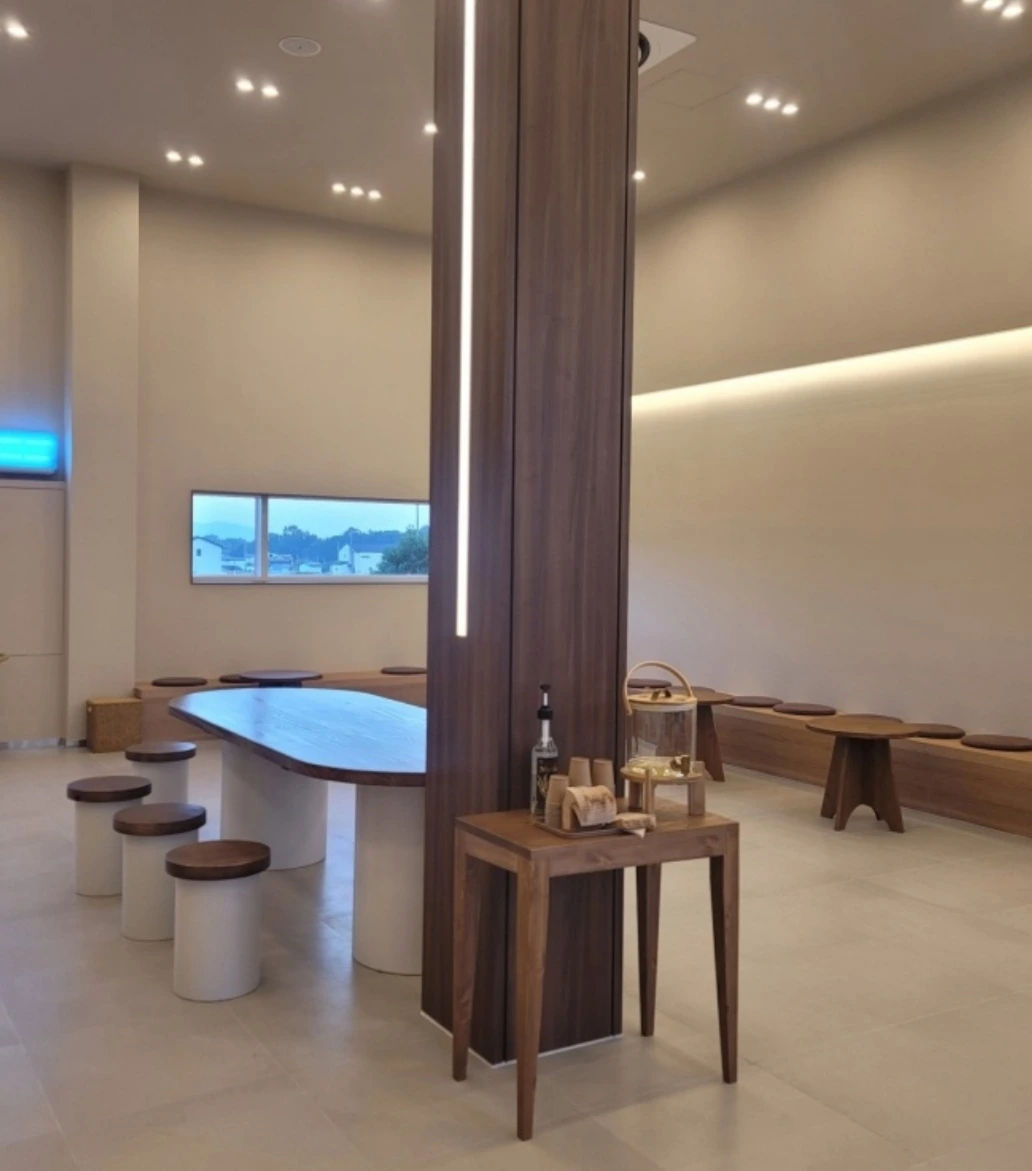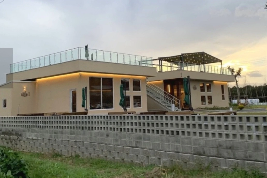 고급스러운 두 개의 건물, 중심부 계단으로 이어진 2층 전망, 확 트인 자연 속 여유 공간 그리고 젊은 층을 겨냥한 미니멀한 인테리어가 눈에 띄었습니다. 연인과 가족을 겨냥한 콘셉트인 듯 보였습니다.