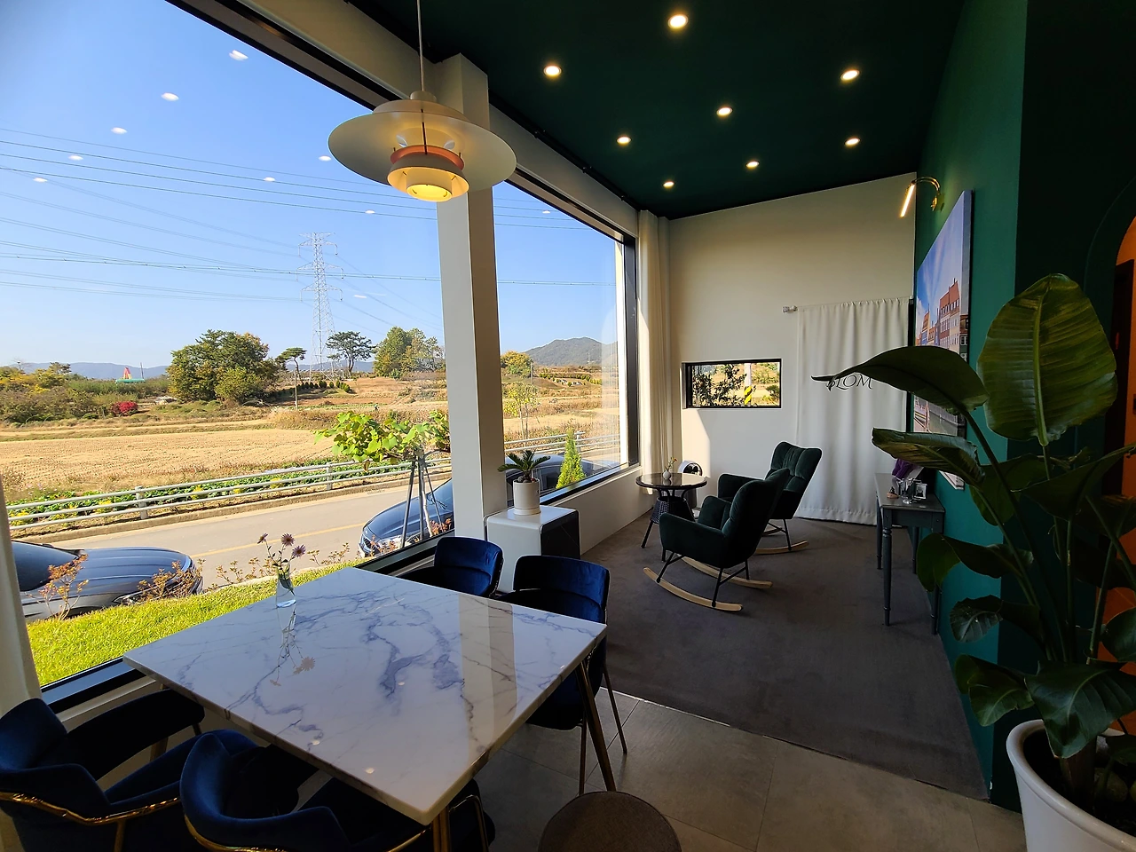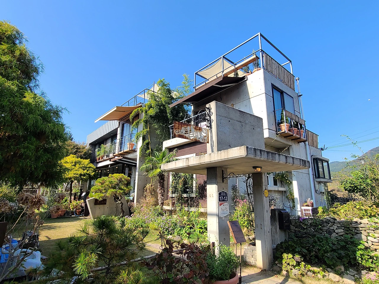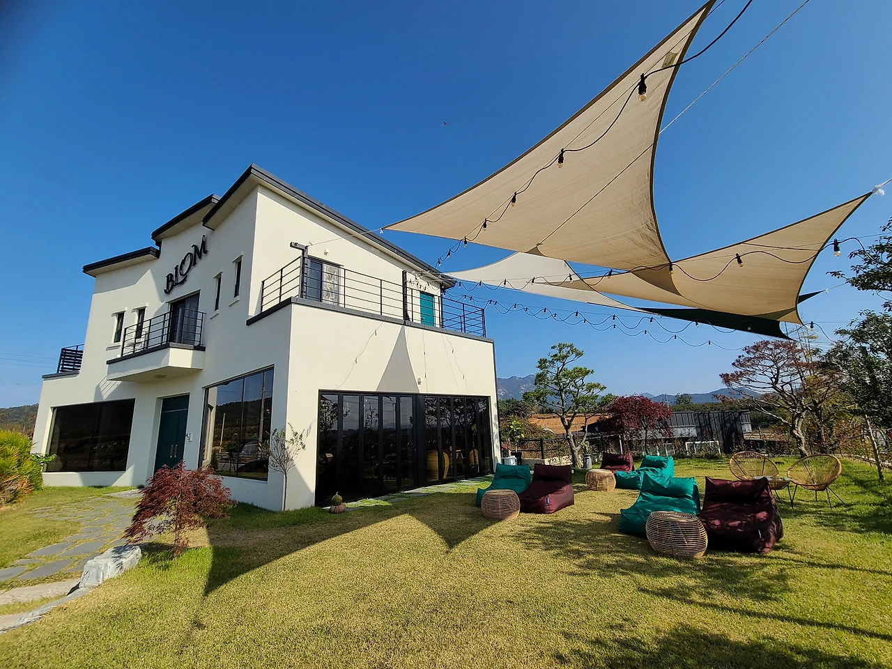 고급스러운 두 개의 건물, 중심부 계단으로 이어진 2층 전망, 확 트인 자연 속 여유 공간 그리고 젊은 층을 겨냥한 미니멀한 인테리어가 눈에 띄었습니다. 연인과 가족을 겨냥한 콘셉트인 듯 보였습니다.