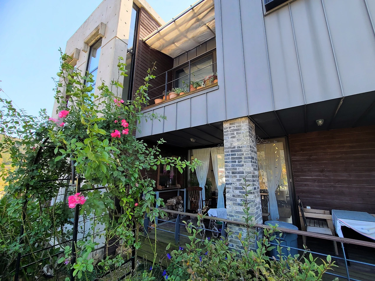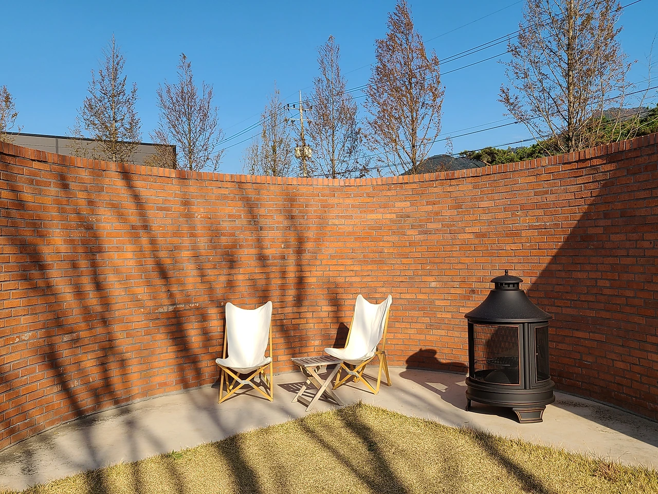 도시 근교라 가능한 넓은 정원과 담벼락이 있었습니다. 바람을 막아 불멍을 할 수 있도록 설계한 특징이 있었습니다. 이른 방문이라 보는 것으로 만족해야 했습니다. 마음이 확 트인 이색적인 카페였습니다. 다음 방문을 기약하면서.