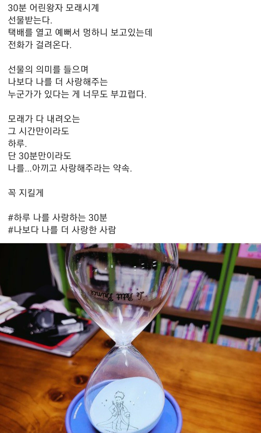 "하루 30분은 당신을 위해 사용해 주세요" 어린 왕자가 새겨진 모래시계를 주며 아내에게 부탁했습니다. 주말 부부, 직장맘으로 몸이 열개라도 부족한 아내는 "하루 중에 나를 위한 시간은 사치일 때가 많다"라고 고백합니다.첫째 중2, 둘째 초5인 아이들의 사춘기, 자매의 보이지 않는 신경전에 유독 힘든 한 해를 보냈기 때문입니다.