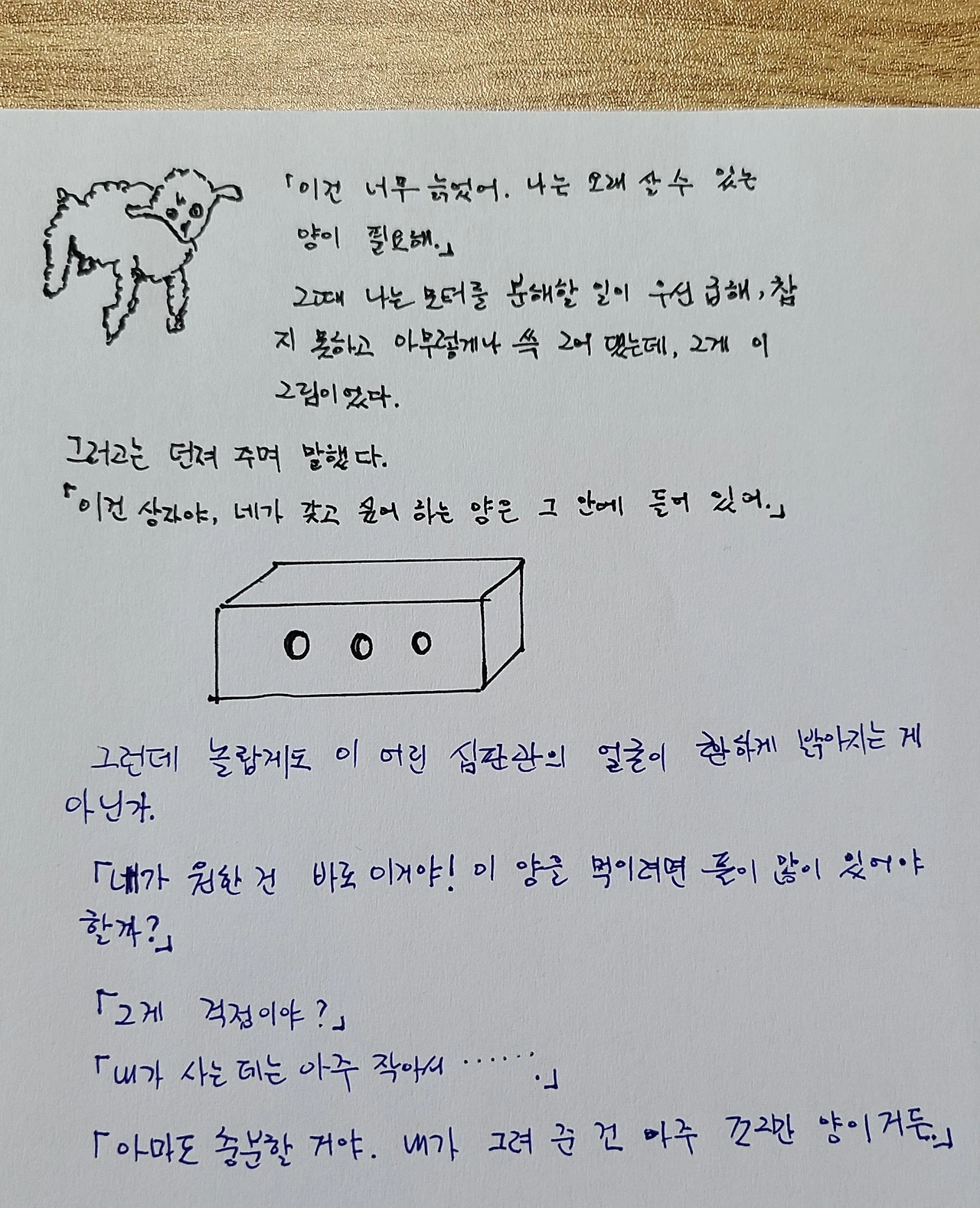 이건 상자야, 네가 갖고 싶어 하는 양은 그 안에 들어있어. 그런데 놀랍게도 이 어린 심판관의 얼굴이 환하게 밝아지는 게 아닌가. 내가 원한 건 바로 이거야! 이 양을 먹이려면 풀이 많이 있어야 할까?