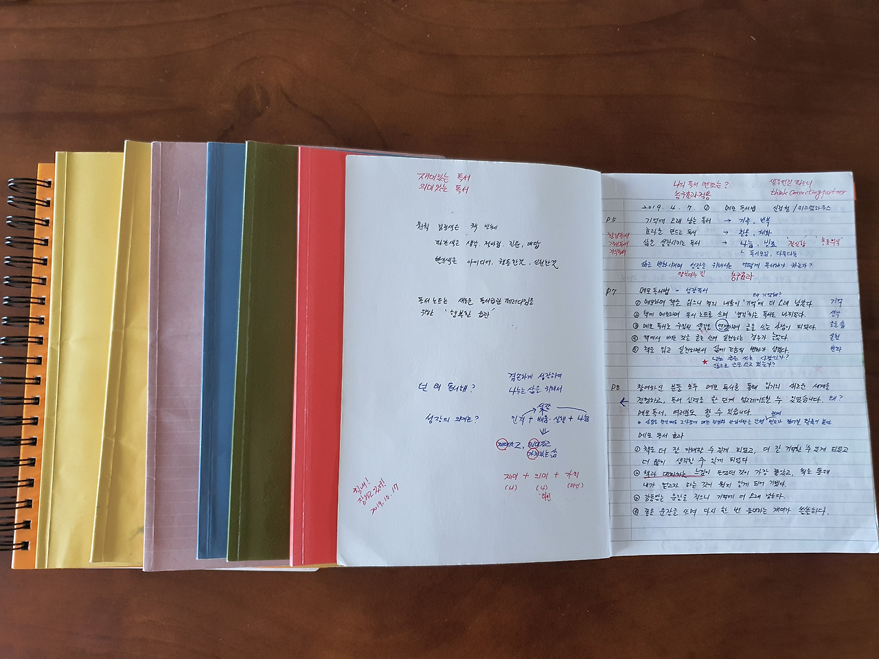 책을 발췌할 때는 검은색, 떠오르는 생각이나 질문과 대답 등은 파란색, 아이디어와 실천할 내용은 빨간색 볼펜을 사용하기로 했다. 첫 책으로 <메모 독서법>을 골랐다. 독서 노트는 몇 권의 책을 읽은 만큼의 시간이 걸렸다. 타자로 치는 것과는 비교할 수 없을 정도로 손가락도 아프고 고된 작업이었다. 포기하고 싶을 때마다 일으켜 주는 문장이 있었다.