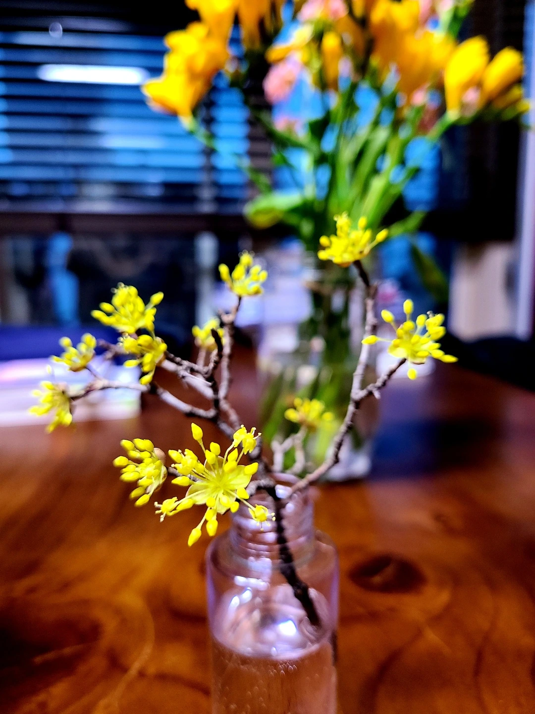 산수유는 '영원불멸'의 의미를 가지고 있습니다. 꽃잎은 아른아른 거리며 아련한 추억이 송송송 떠오릅니다. 흐드러지게 핀 안개꽃처럼 노란 꽃은 '주인공은 나야 나'라며 만개합니다. 아내에게 봄은 노란색인가 봅니다.거실에 봄을 초대하니 한결 마음이 가벼워집니다.