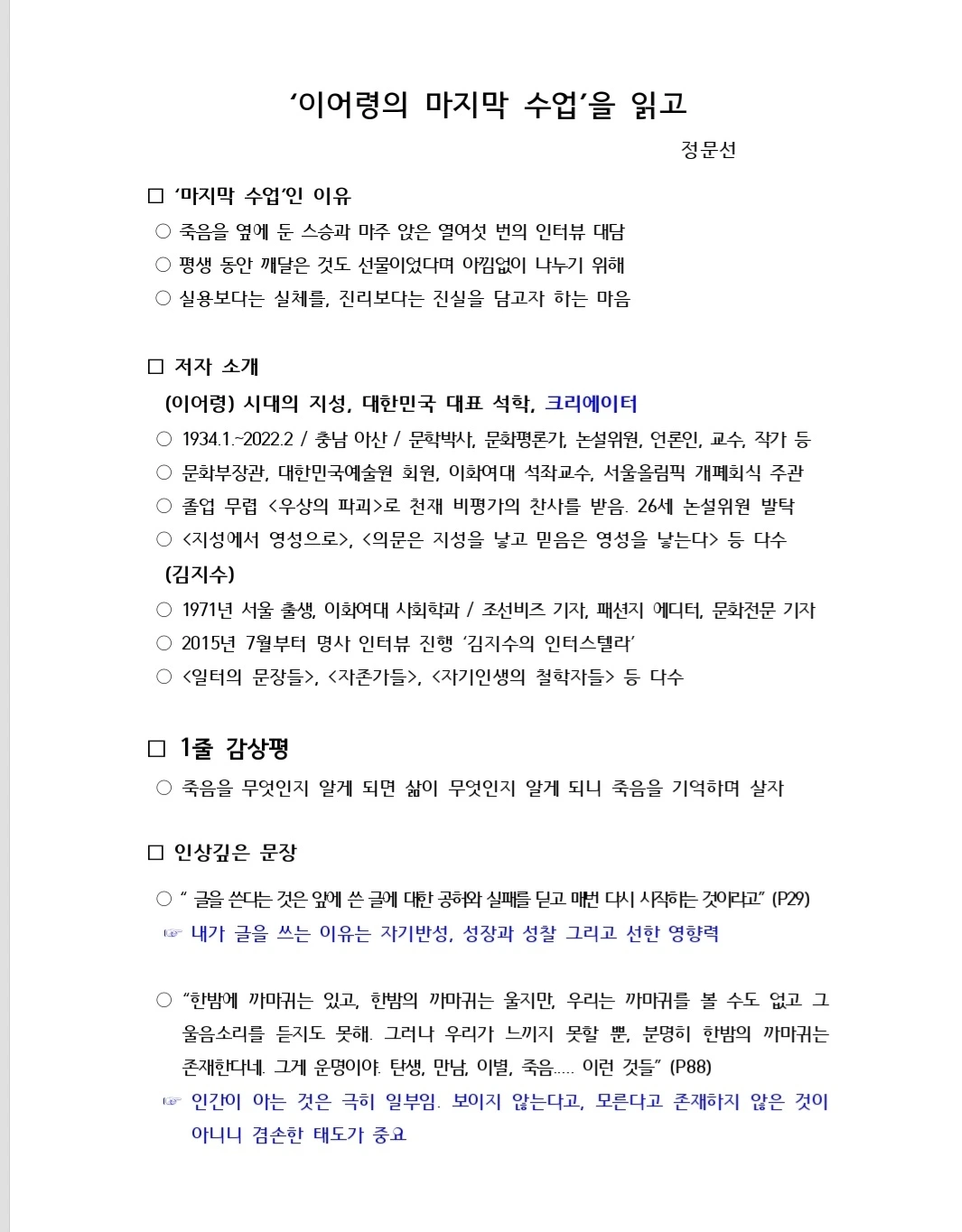 오늘 토론할 책은 "이어령의 마지막 수업"이다. 5명이 참여하여 매달 돌아가며 발제하는 방식으로 운영된다. 4명이 참여해 생각을 나눴다.