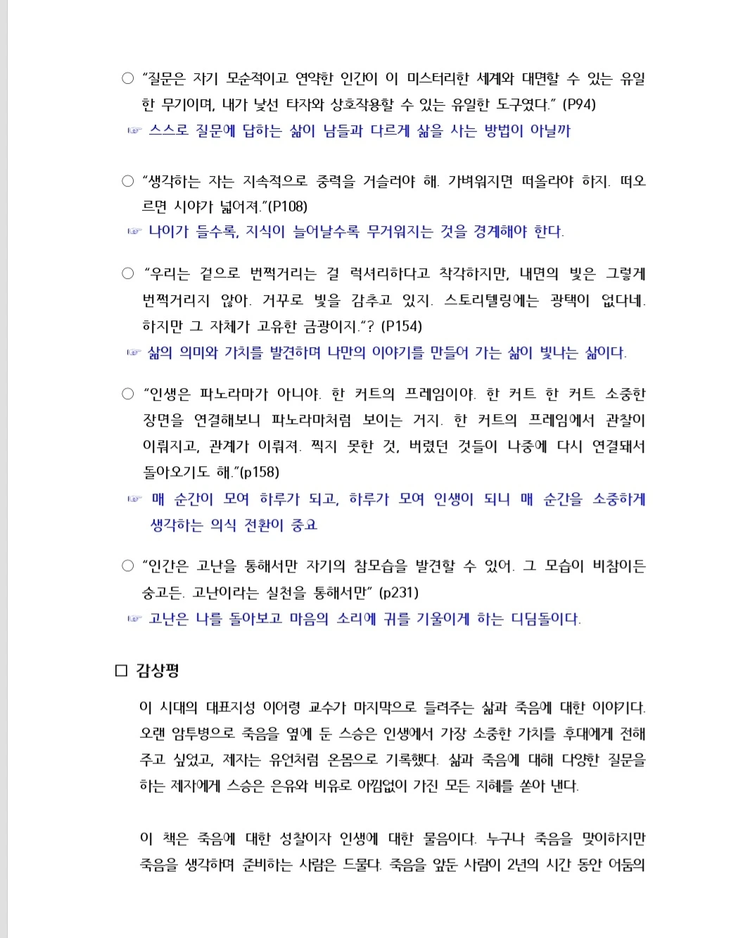 1. 럭셔리하게 살고 있는가? 153p <스토리> 2. 화문석 or 무문석으로 살건가? 179p <자기 무늬> 3. 現 내일이 나에게 놀이였는가? 261p <직업연계> 4. 디지털/아날로그/디지로그 삶? <현재 삶 > 5. 죽음 태도/준비/생각 <저자와 비교> 6. 내 인생에 선물은? 7. 인상 깊은 구절과 이유 <하나를 뽑는다면>