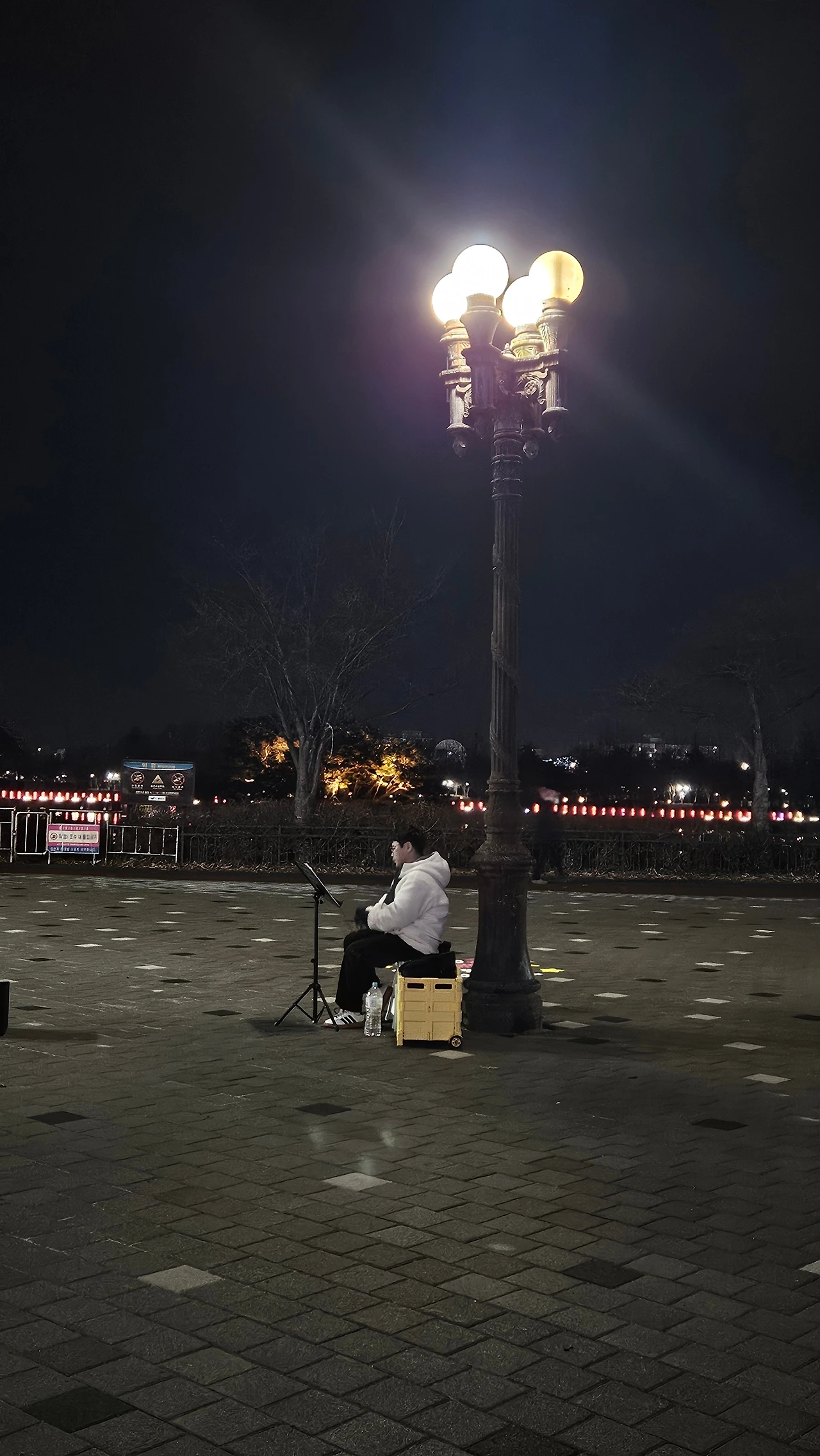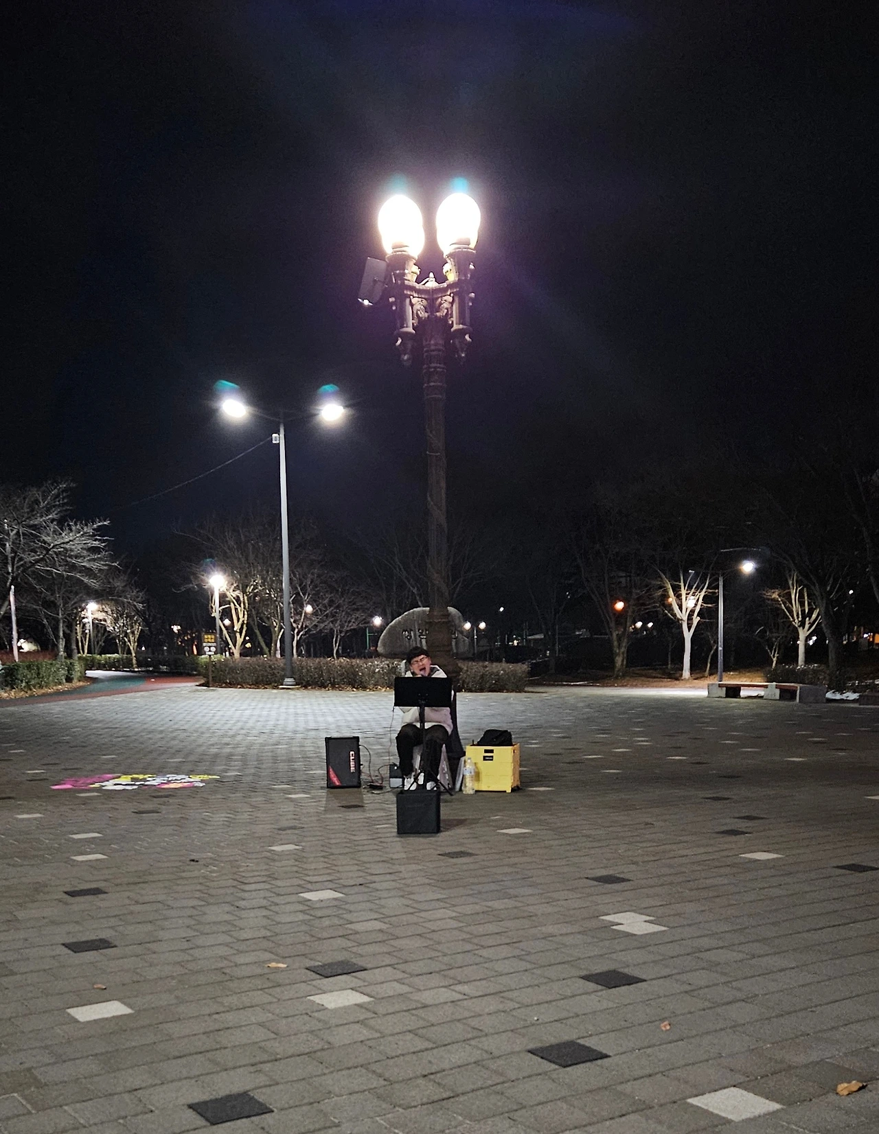 지난 주말 저녁, 인근 공원에 산책 갔다. 매일 만보 걷기 인증을 위해서다. 강추위는 풍경도 낯설게 만든다. 평소 많은 이들로 북적이던 공원 길이 간간이 보이는 사람들로 한산했다. 목도리를 얼굴까지 감싼 분, 롱패딩을 입은 채 움츠리는 분, 잠바를 입고 러닝 하는 분, 강아지를 앞 세워 걷는 사람까지 다양한 산책의 풍경이다. 불어오는 칼바람은 맨살을 찌르듯 날카롭다. 이런 날에 들리는 노랫소리는 예사롭지 않다. "이렇게 추운 날 누가 공연을 할까" 노래가 이끄는 쪽으로 향했다. 광장 한 켠에서 버스킹을 하고 있는 한 남성이 있었다. 관객이 아무도 없어 지나칠 수가 없었다. 몇 명의 관객이 올 때까지 자리를 지키자며 선 채로 몸을 좌우로 흔들면서 노래를 들었다. 길거리 가수는 무슨 사연으로 이 추운 곳에서 노래를 부르고 있을까.