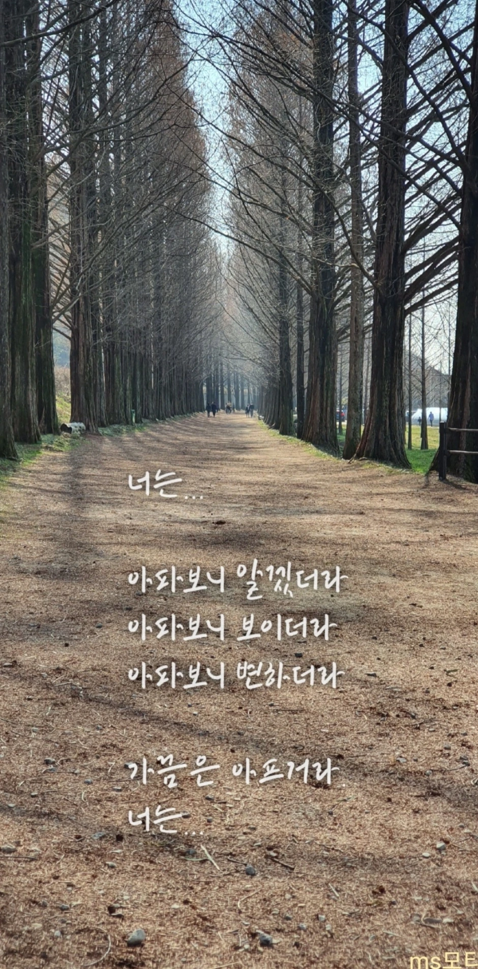 그 길을 걸을 때마다 선배가 생각난다. 길은 계절마다, 날씨마다 다른 옷을 입고 그 자리에 서 있다. 봄이면 연둣빛 잎들이 햇살에 반짝이며 “다시 시작해 보라”라고 속삭이고, 여름에는 짙은 초록이 지친 마음을 덮어준다. 가을엔 낙엽이 바람에 날리며 성숙한 삶을 말해주고 겨울에는 앙상한 나뭇가지 사이로 드러난 숲이 버림의 미학을 알려준다.