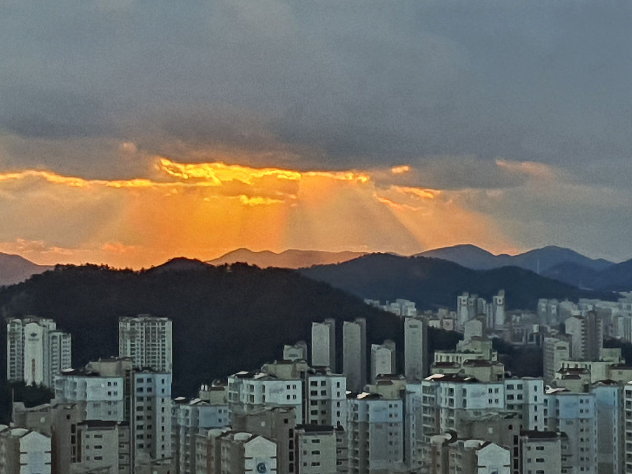 구름 속에 비치는 햇살이 예사롭지 않습니다.
