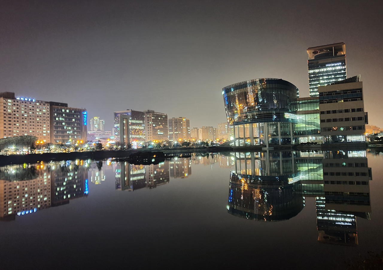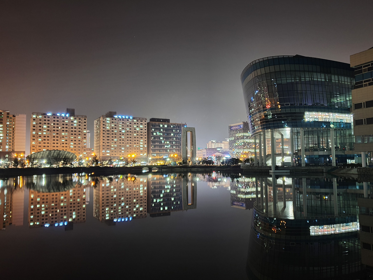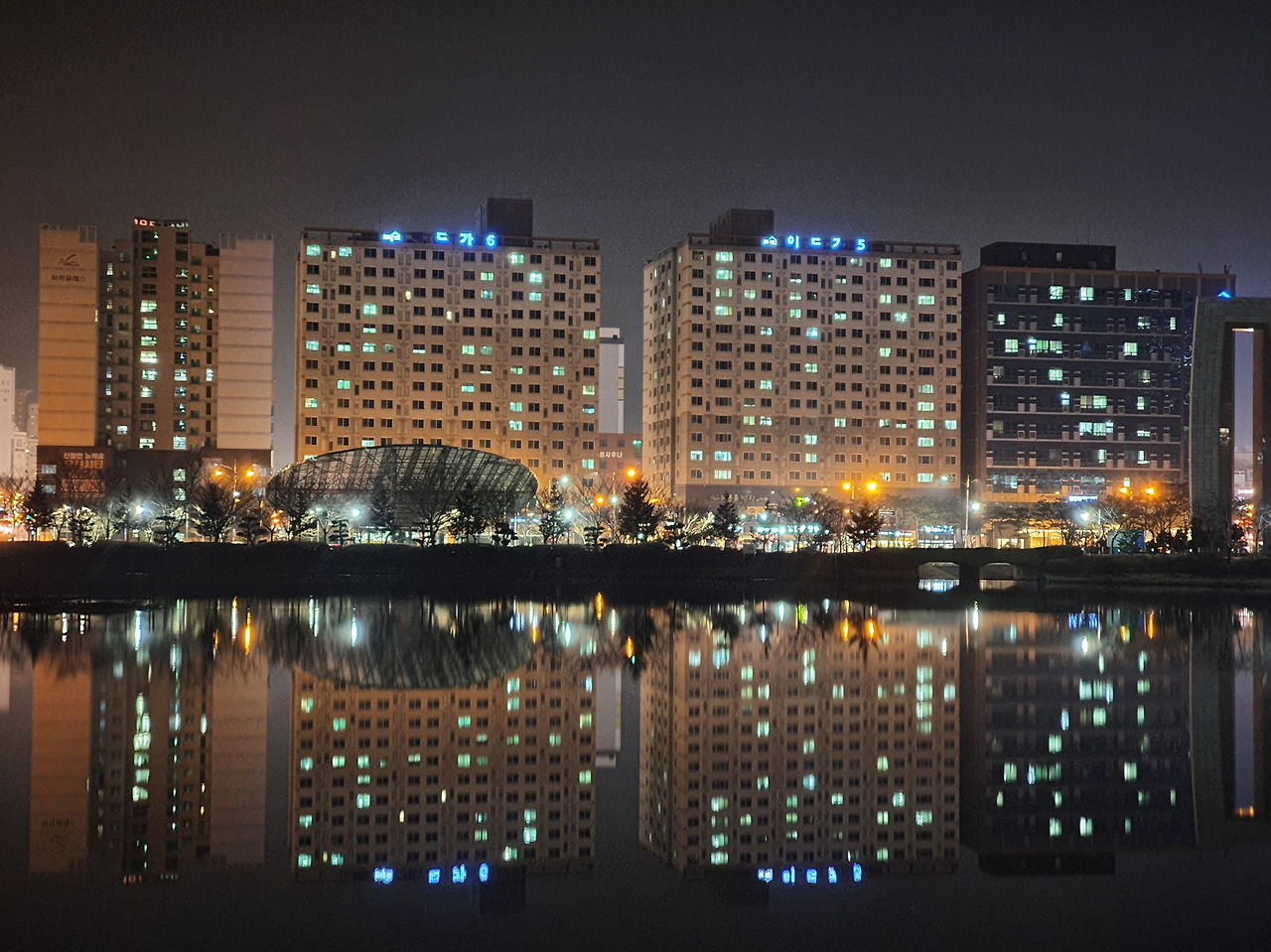 낮에는 밋밋한 건물이 어둠 속에는 빛과 하나 되어