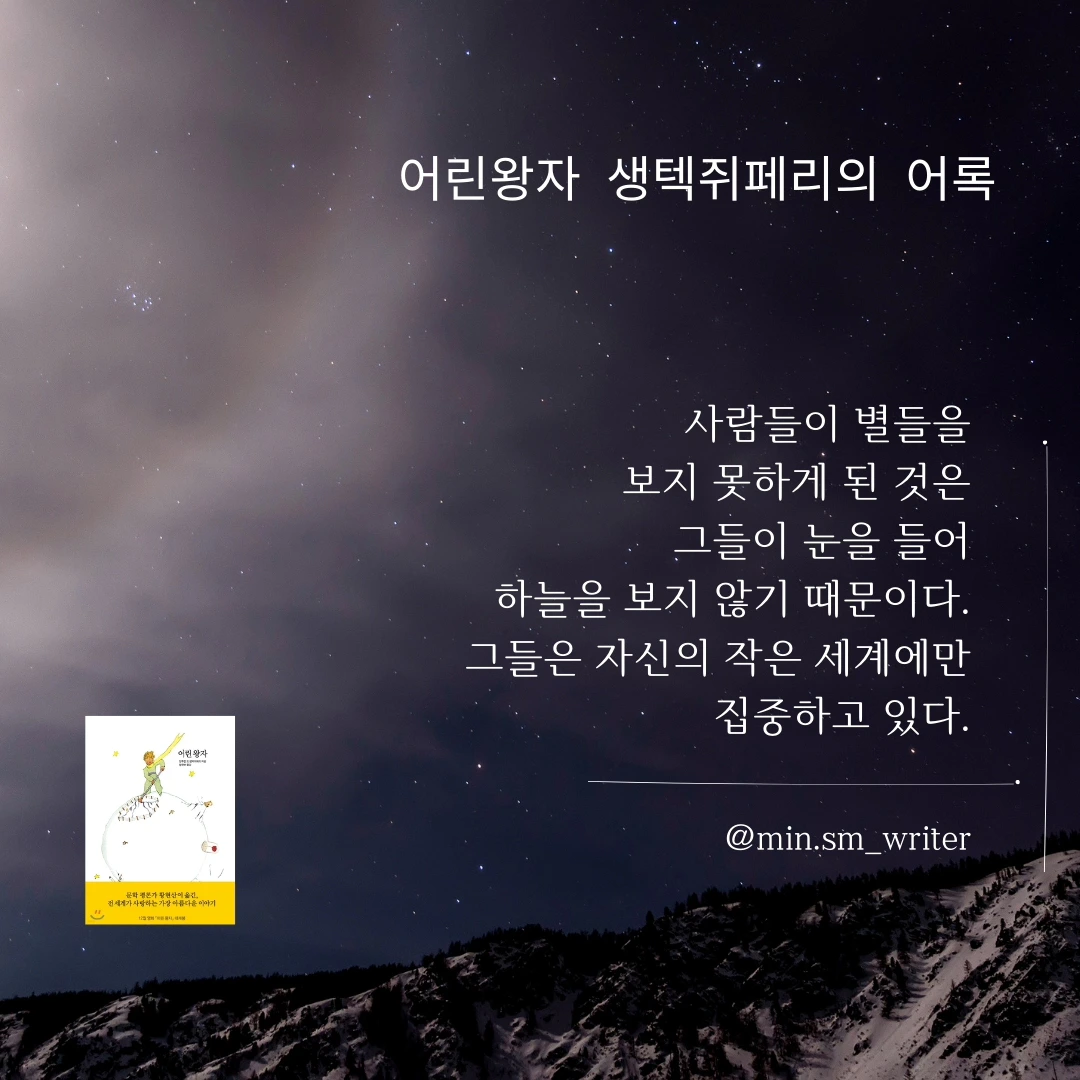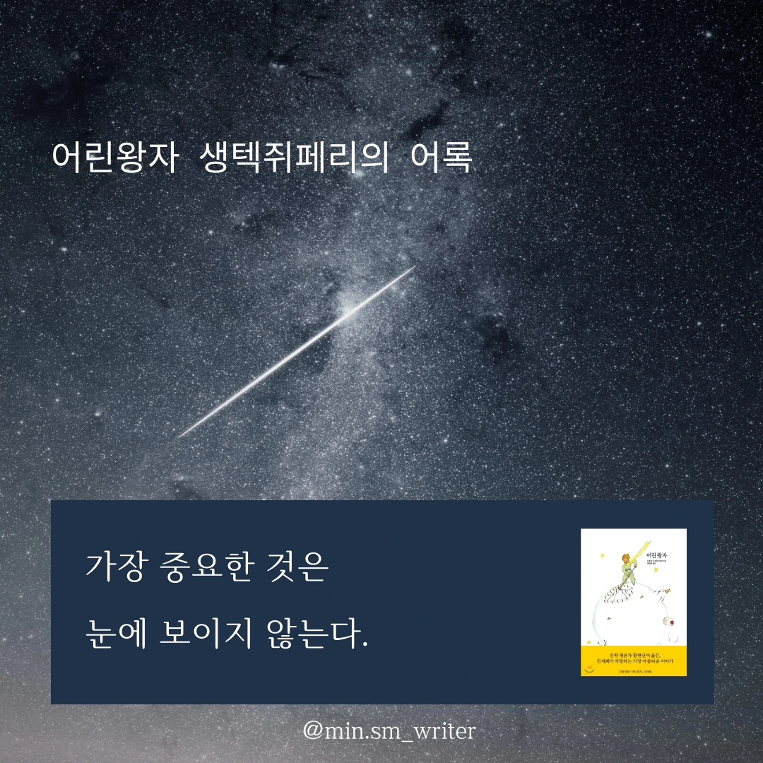 어린 왕자를 지은 생텍쥐페리의 어록을 알려드릴게요. 비행 조종사였던 그는 그림 그리고 글을 쓰는 것을 좋아했어요. 그가 직접 그린 삽화가 함께 수록된 어린 왕자는 세상에서 성경 다음으로 가장 많이 읽히는 불멸의 고전이에요.