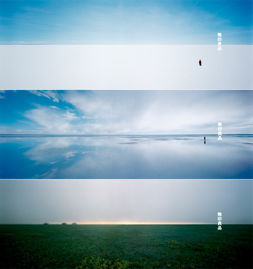 순백의 대지와 푸른 하늘이 맞닿은 지평선 위에 점처럼 서 있는 소녀, 그리고 한편에 박힌 ‘無印良品(무인양품)’ 네 글자. 그는 “지평선이란 아무것도 없는 풍경이지만, 반대로 모든 것이 있다고 할 수 있다. (이는) 무인양품의 미래를 담아내는 그릇이며 비전”이라고 했다.