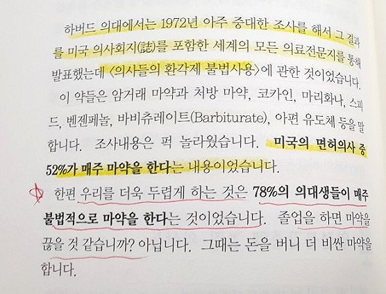 놀라움의 두 번째였다. 미국의 면허의사 중 52%가 매주 마약을 한다는 내용이었다. 그것도 불법적으로 마약을 한다는 것이다. 얼마 전에 TV에서 의사면허가 없는 사람이 의료 행위를 해서 떠들썩했는데 순간 자연사하는 거랑 치료를 받다가 죽는 거랑 뭐가 다를까라는 생각이 들었다. 그래서 그런지 의사들이 가끔 수술해야 하는 다리가 아닌 성한 다리를 치료하고 그랬는데 이것도 그 때문인가 싶었어요. 요즘에도 유명 연예인이 마약에 연루되어 뉴스에 매일 나왔던 기사가 생각나네요. 마약공급책이 의사였다는 실망감이 더해져 실망스러웠다.