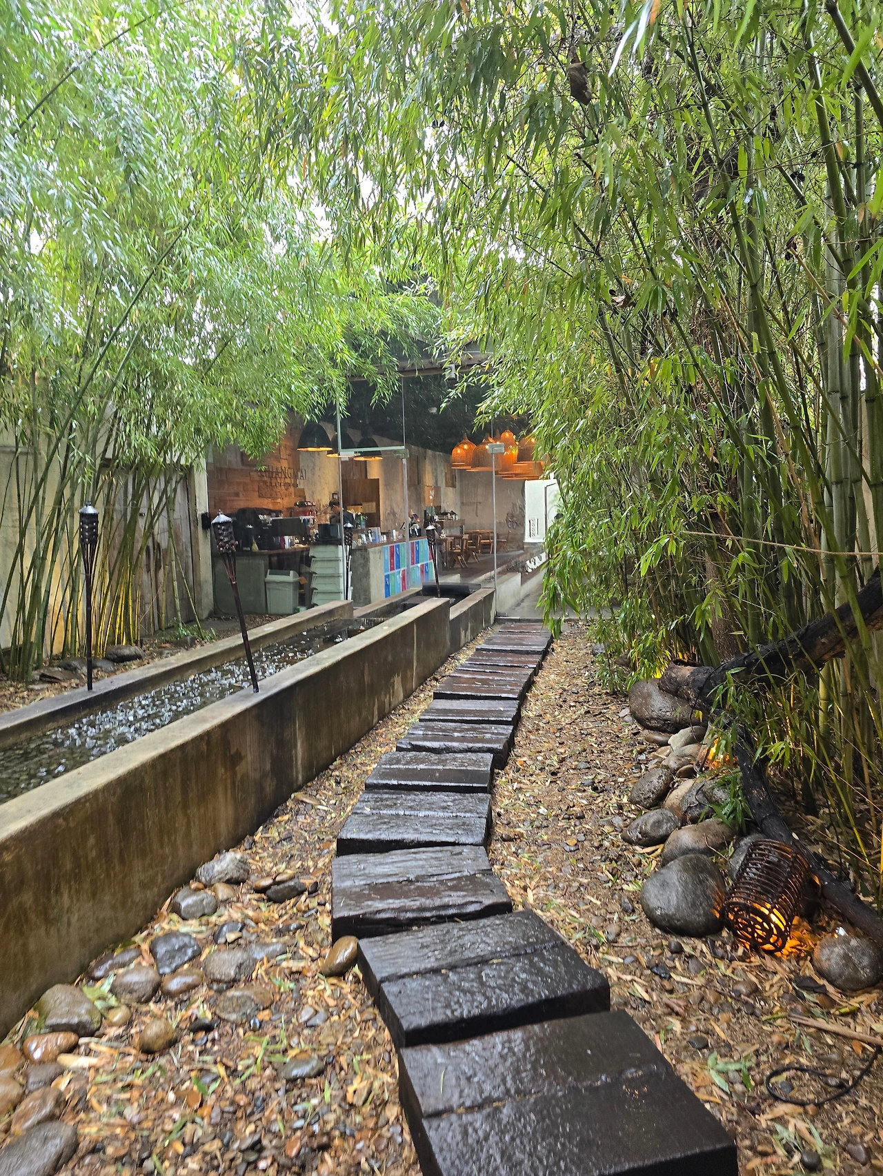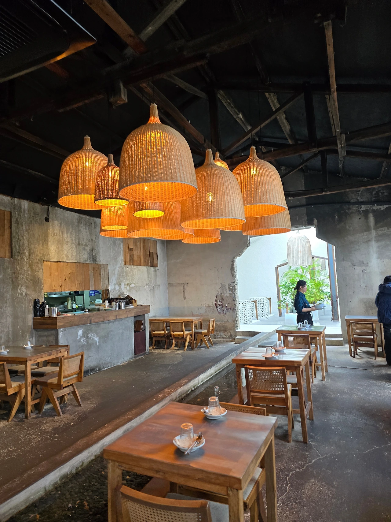 입구부터 예사롭지 않은 돌담길옆에 대니무숲이 여행의 시작을 알렸다 들어서자마자 천장에 달린 따뜻한 색의 조명 아래, 나무 테이블들이 간격을 두고 놓여 있었다.