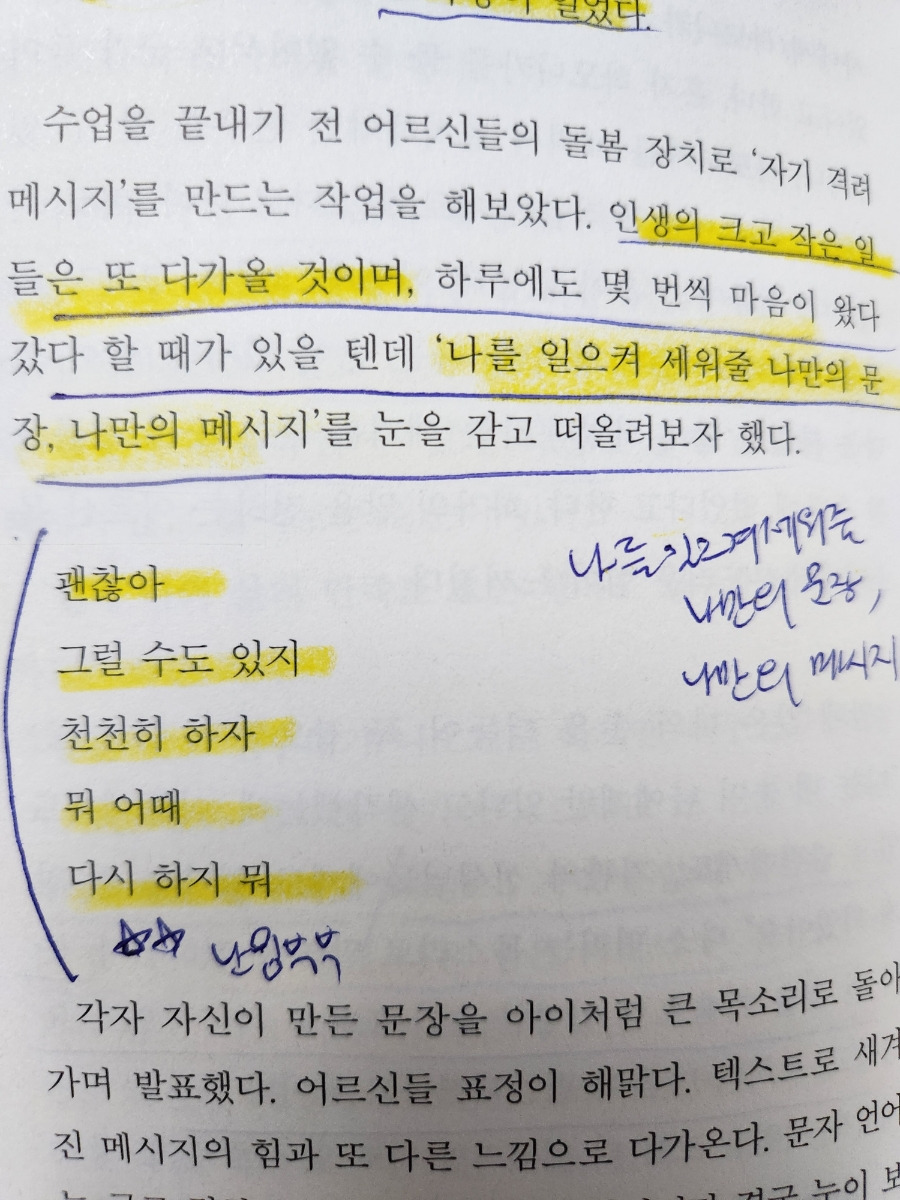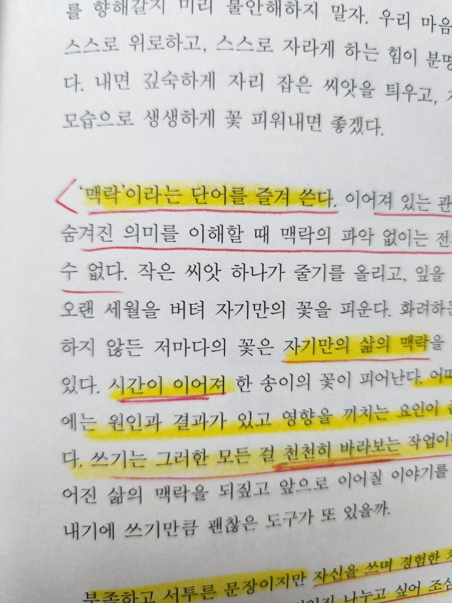 자신이 어디로 있는지아는 사람은길을 잃지 않는다.주위를 돌아볼 여유가 있다.언어는 글로 태아나 종이 위에 머무를지라도우리는 자신이 쓴 글을 통해 매일 성장해 나가리라_누구나 글의 씨앗을 품고 산다
