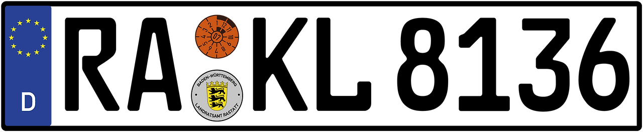 좀 더 자세히 얘기하자면, 좌측 이미지는 유럽연합을 상징하고 'D' 알파벳은 도이칠란트(Deutschland)의 D를 의미합니다. RA(Rastatt, 라슈타트)는 시·군단위 지역명의 약자입니다. 국내를 예로 들면, 서울, 고양, 성남 등이 쓰여 있다고 보면 되겠습니다. 가운데에는 비표 두 개가 위 아래 하나씩 부착돼 있는데요, 위에 있는 게 자동차 검사기간과 관련된 거고, 아래가 주에서 발급한 일종의 인감같은 겁니다. 주를 상징하는 문장이 들어가 있는 게 인상적이네요. 그 옆으로 나열돼 있는 KL 8136은 랜덤입니다. 단, 우리나라 돈으로 약 2만원 정도를 지불하면 자기 맘대로 알파벳+숫자를 조합할 수 있습니다(국내 도입이 시급합니다).